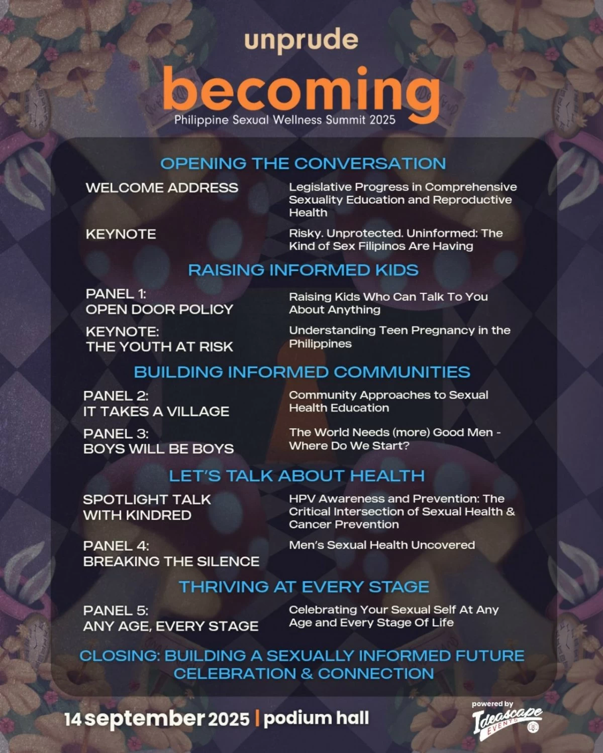 Becoming: The Philippine Sexual Wellness Summit 2025 is organized by Unprude, founded by Dr. Rica Cruz, with event production support from Ideascape MNL.
