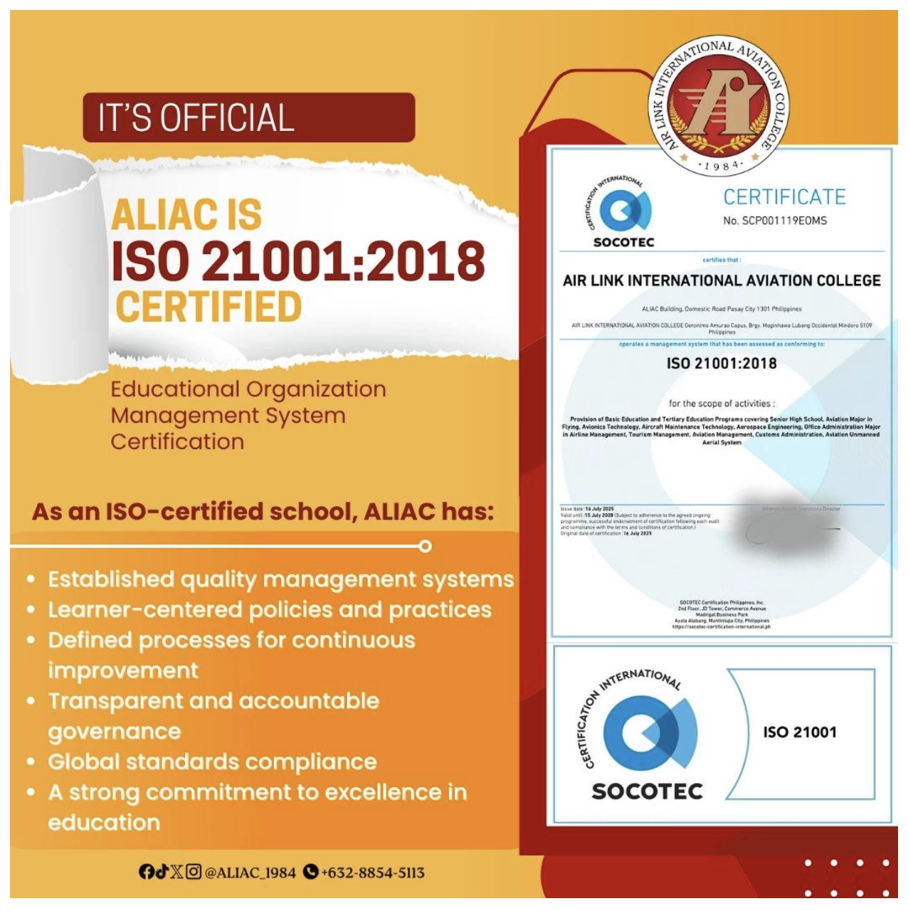 The certification was officially issued on July 16, 2025, and will remain valid until July 15, 2028. It covers the full scope of ALIAC’s Basic and Tertiary Education Programs, including Senior High School and degree offerings such as Aviation major in Flying, Avionics Technology, Aircraft Maintenance Technology, Aerospace Engineering, Office Administration major in Airline Management, Tourism Management, Aviation Management, Customs Administration, and Aviation Unmanned Aerial Systems.