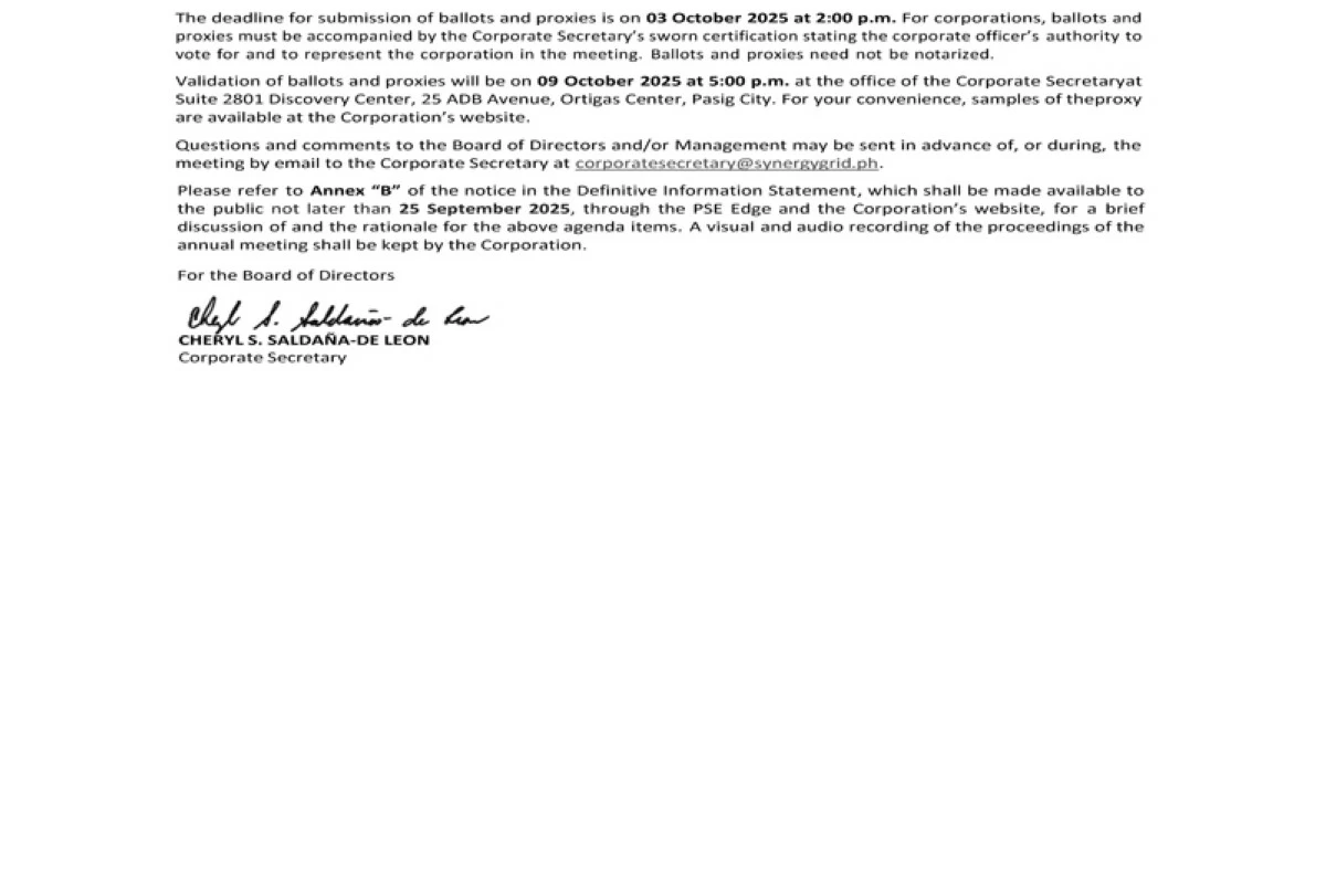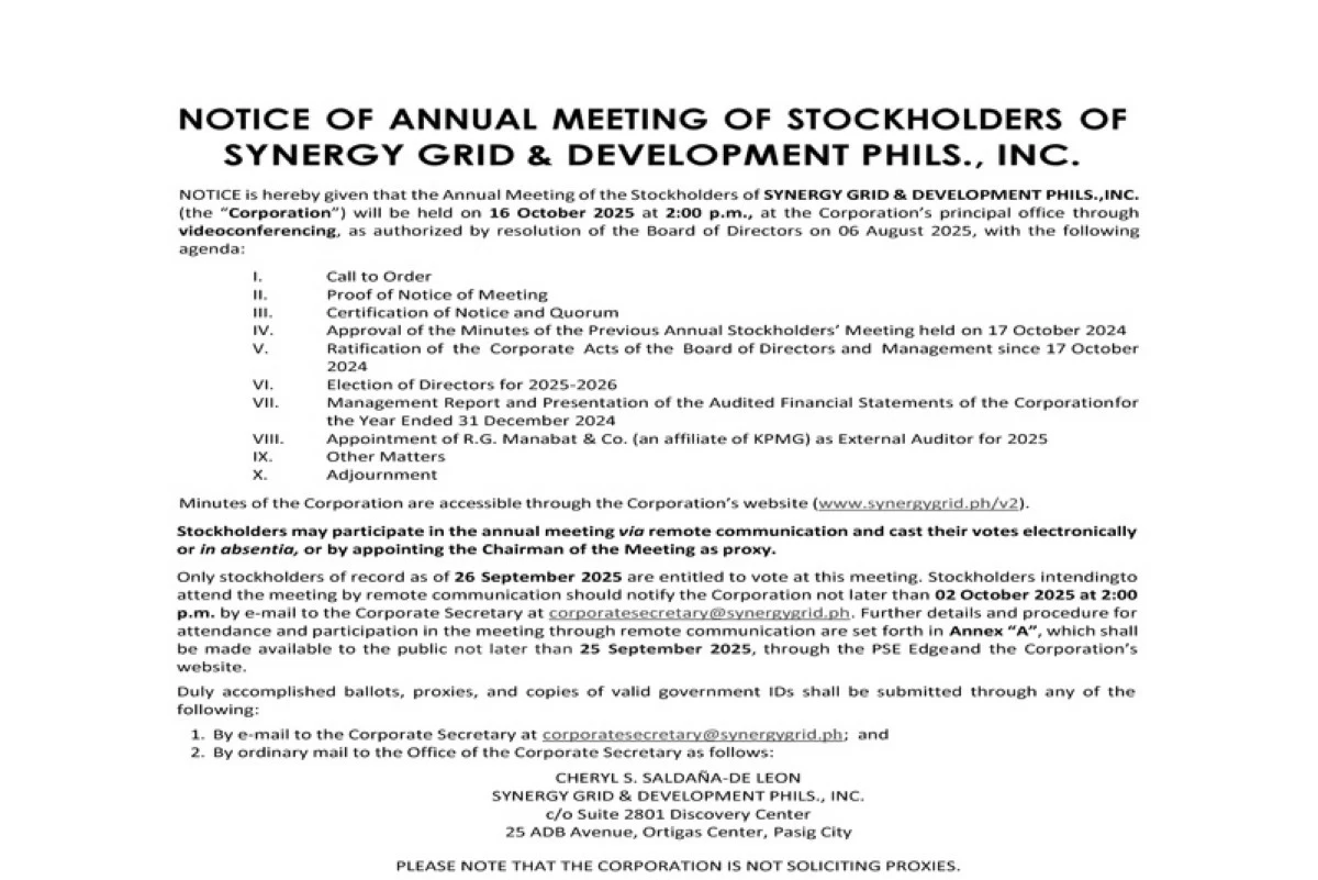 Synergy Grid & Development Phils., Inc. will conduct its annual meeting of stockholders on October 16, 2025, at 2:00 PM, at the Corporation's principal office through videoconferencing. Stockholders may participate in the annual meeting via remote communication and cast their votes electronically or in absentia, or by appointing the Chairman of the Meeting as proxy.