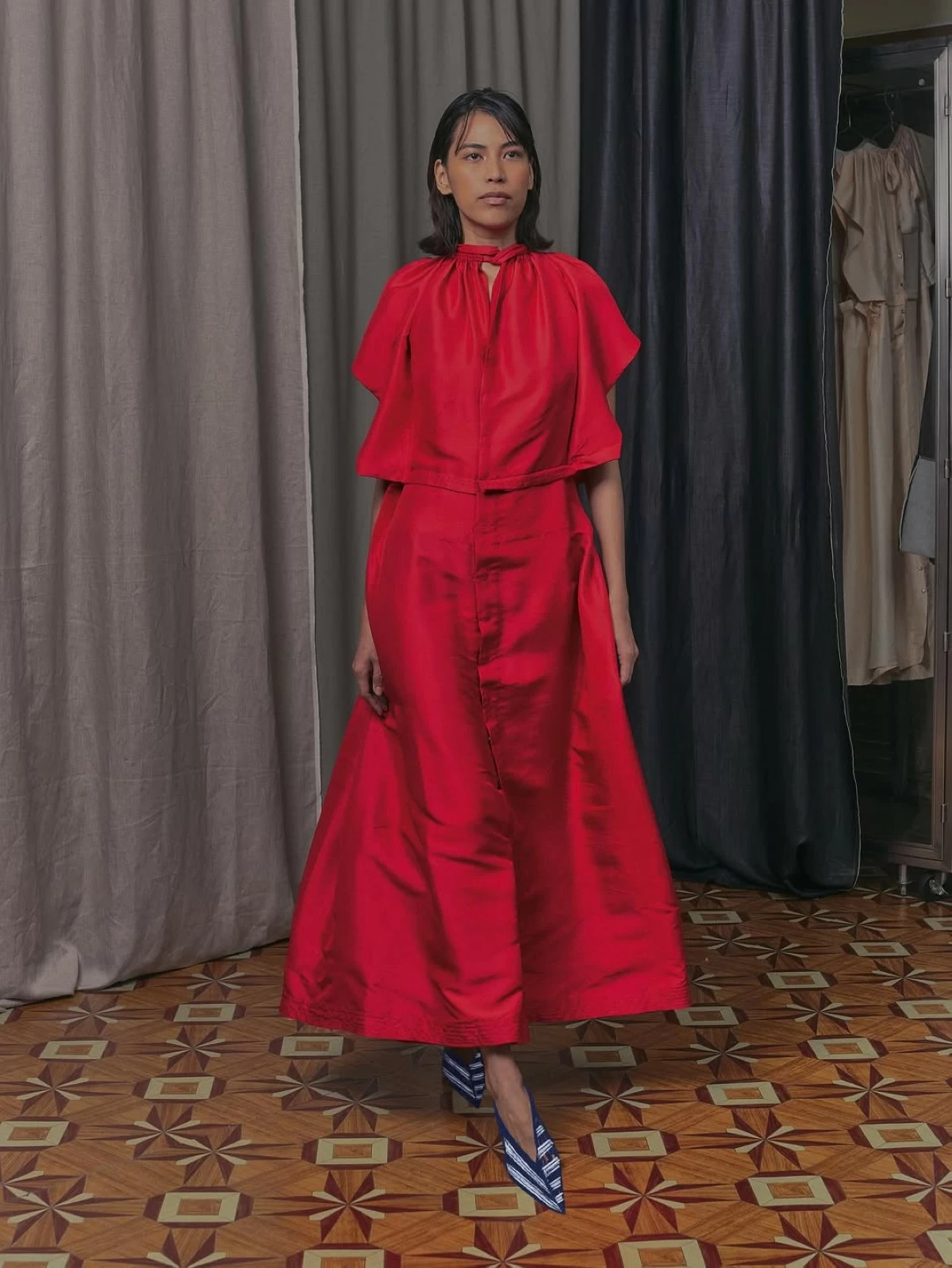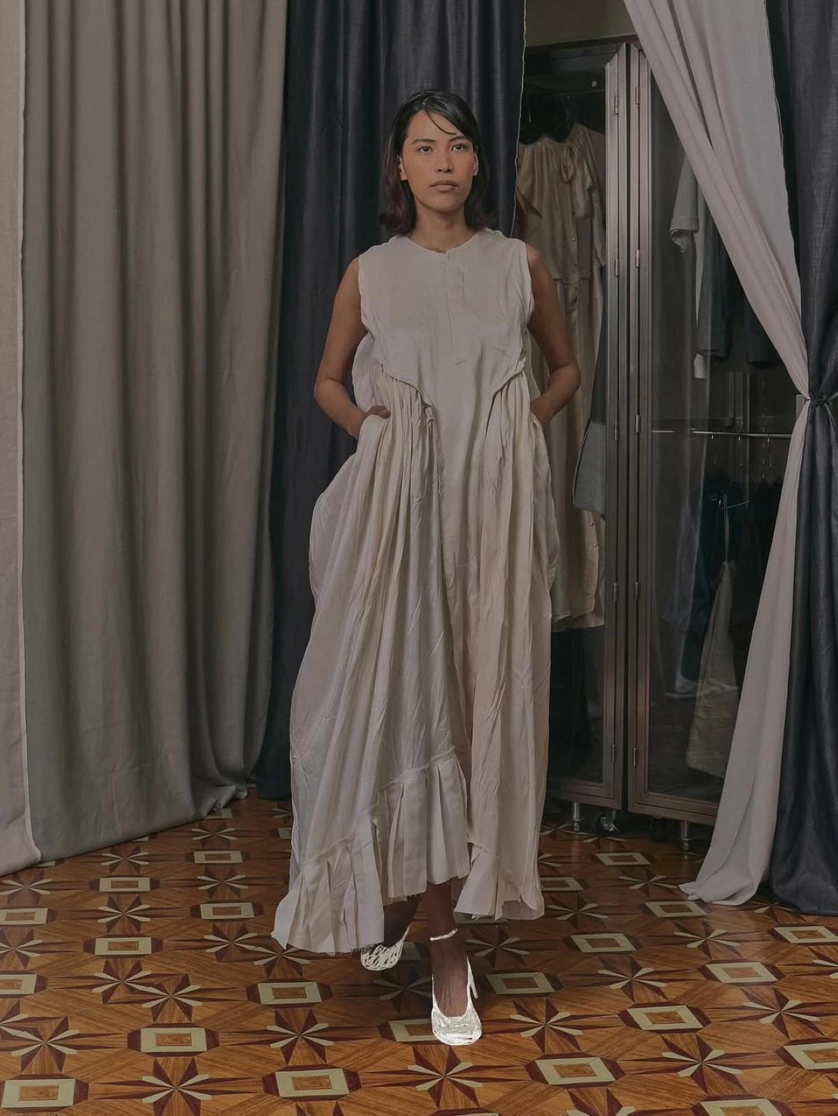 One of the collection’s highlights is the team’s attention to detail. Stitchings and frills add charm to Teodora daster dress, while pleats and raw edges embody the designer’s philosophy of finding beauty in the unexpected.