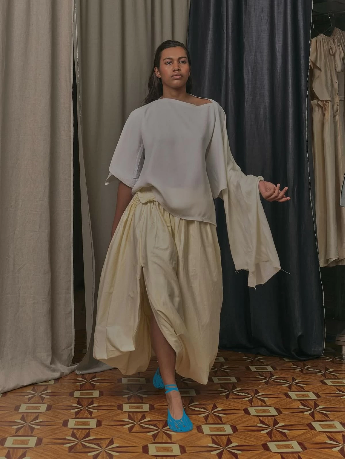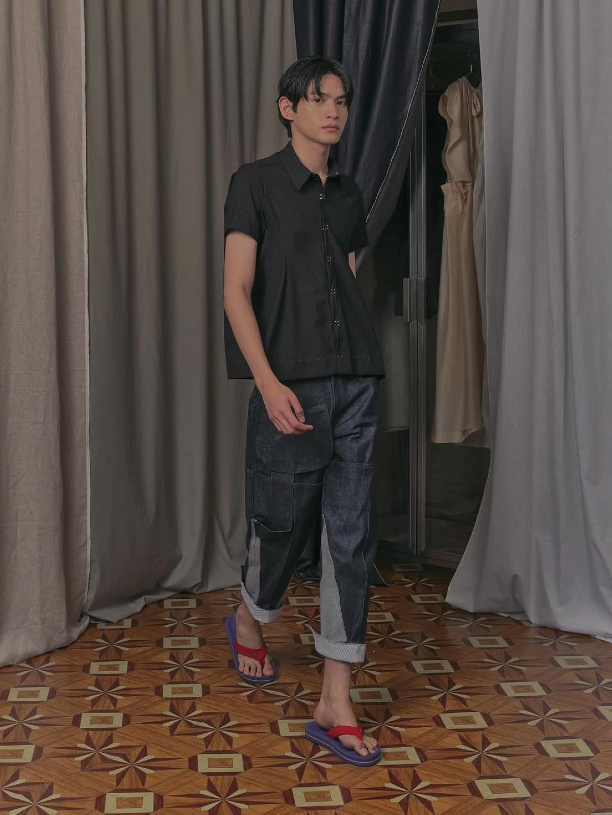 “Vol. II” is all about contrasts—volume and restraint, refined and raw, and work and play. It features balloon trousers reworked with darts and pleating, double-bubble saya skirts, and trapeze tent dresses with corseted fronts. Cropped polos, reversible blouses, and overshirts with rounded or pointy collars reflect CJ’s ease-with-subversion approach, encouraging layering and re-styling. The collection’s free-cuff jeans and barrel-cut Kayod trousers spotlight the design team’s textile exploration, particularly with chambray and Japanese denim.
