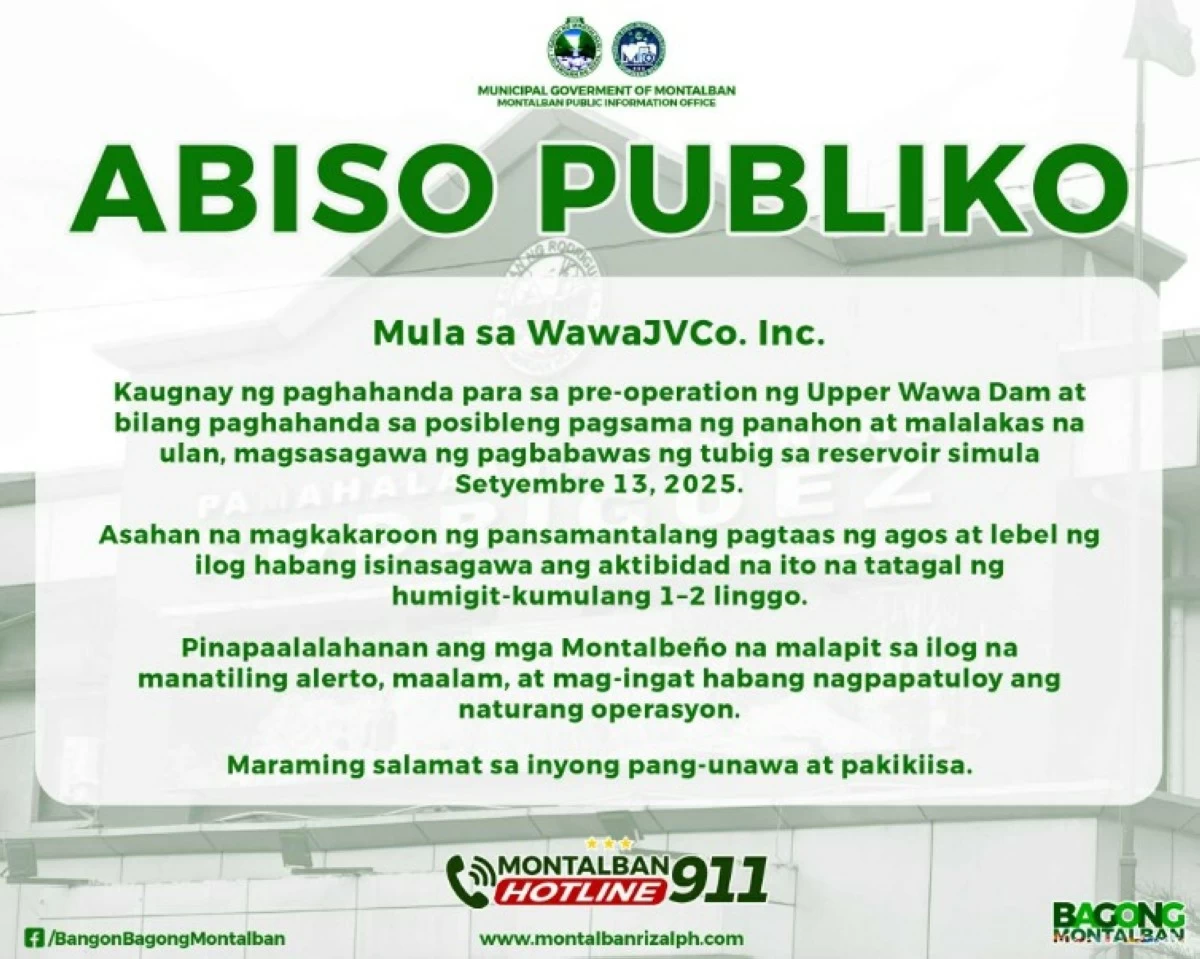 The municipal government, in its advisory on its social media page, announced that the Upper Wawa Dam has scheduled a water reduction activity in its reservoir for one to two weeks starting on September 13.