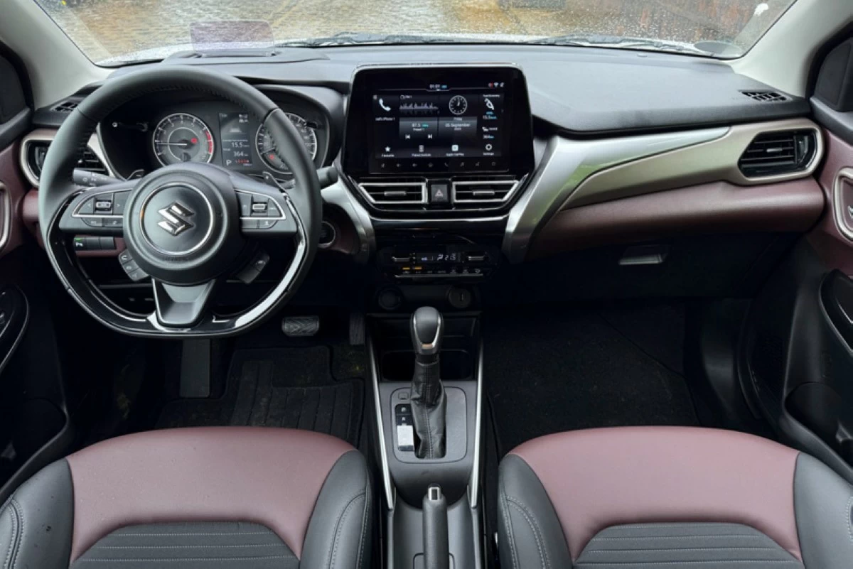 Suzuki implemented what they call a smart and modern cabin design, which comfortably seats five adults. The interior is upholstered in a combination of black and burgundy, with a mix of synthetic leather and a cloth like material. The door trims and dash have a mix of hard plastics and soft touch materials, which were mostly in burgundy. The rest of the cabin is trimmed in piano black and a mix of gloss and brushed aluminum finish.