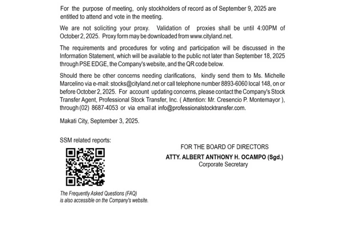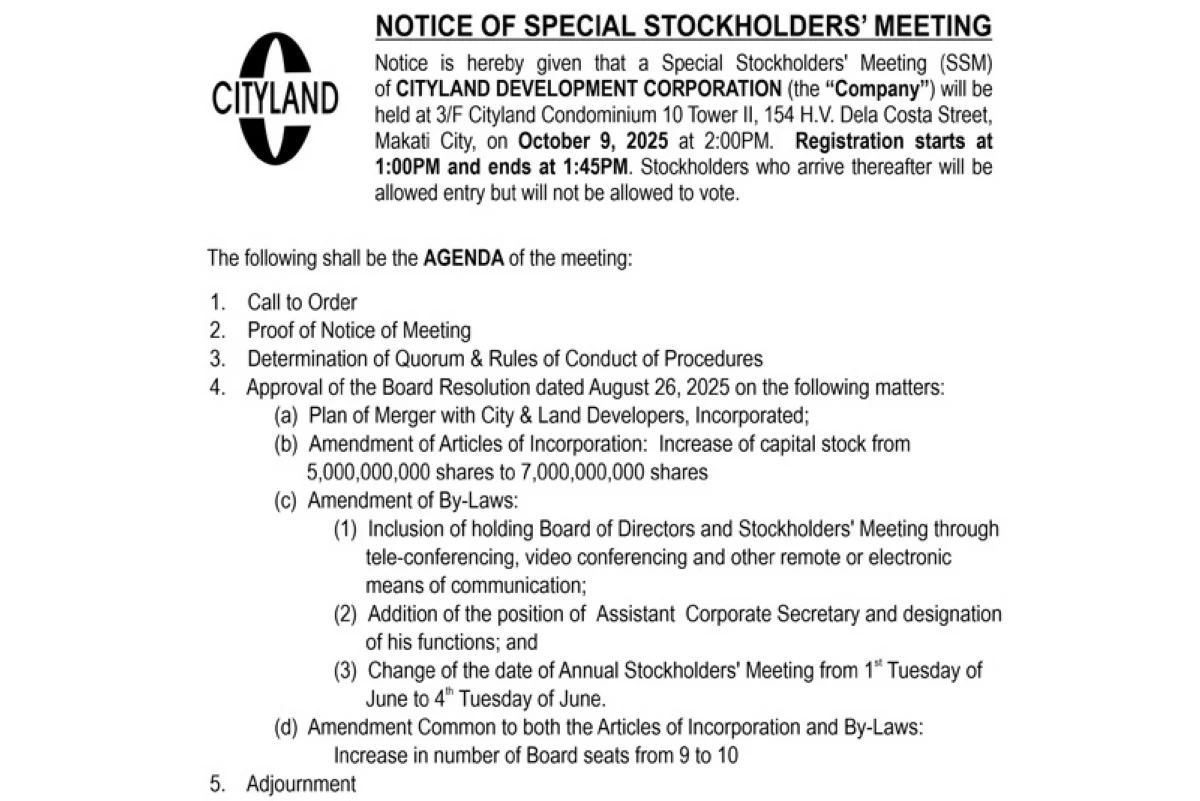 - Cityland Development Corporation will hold its Special Stockholders' Meeting on October 9, 2025. Time, venue and details to participate are listed here.