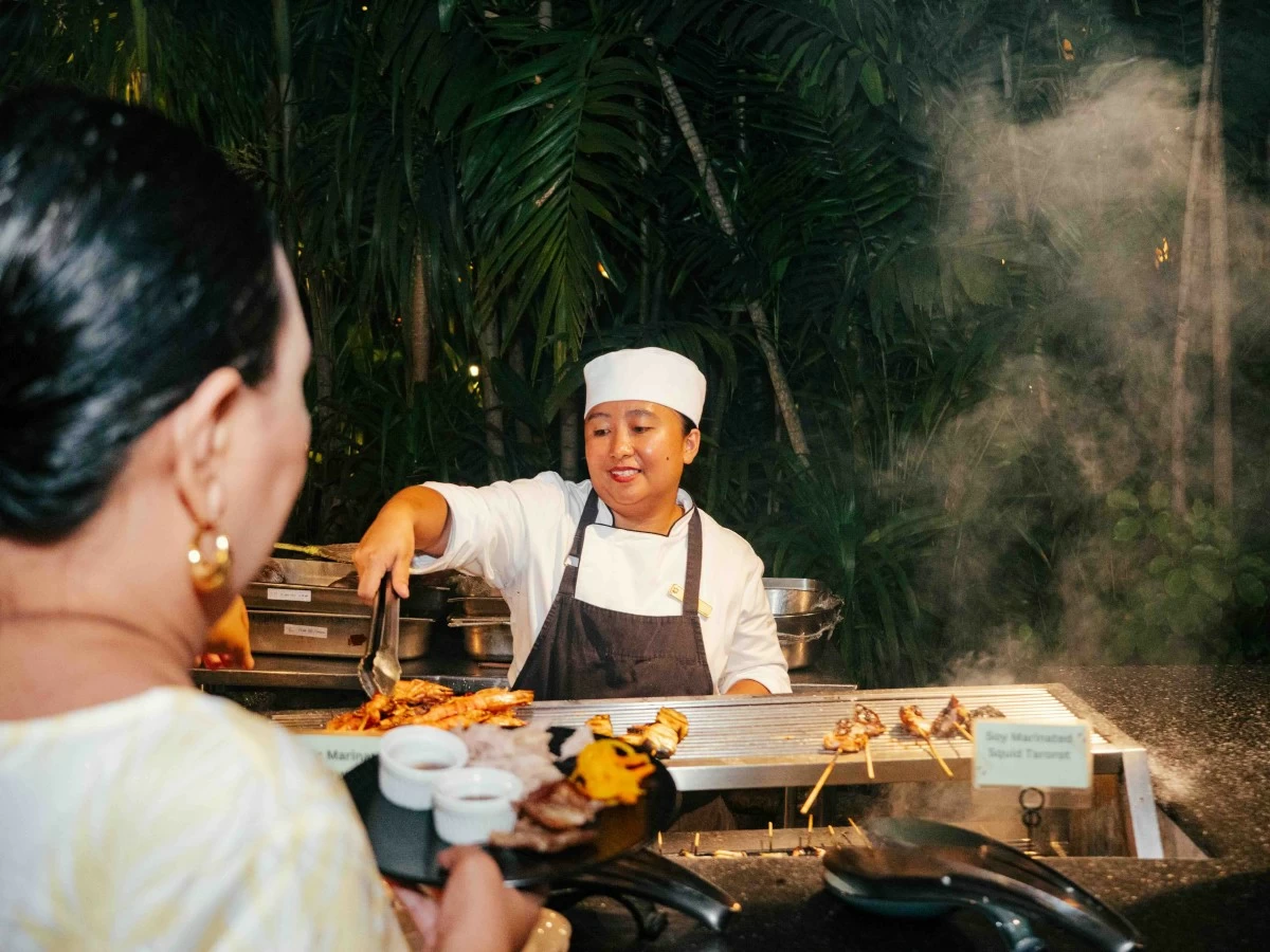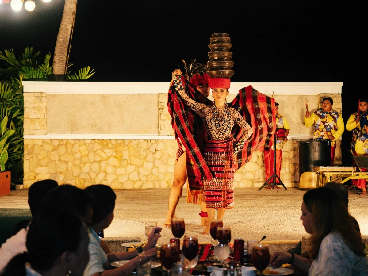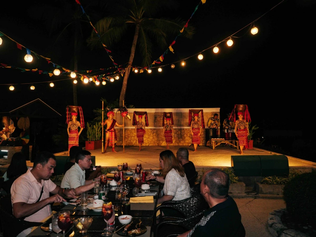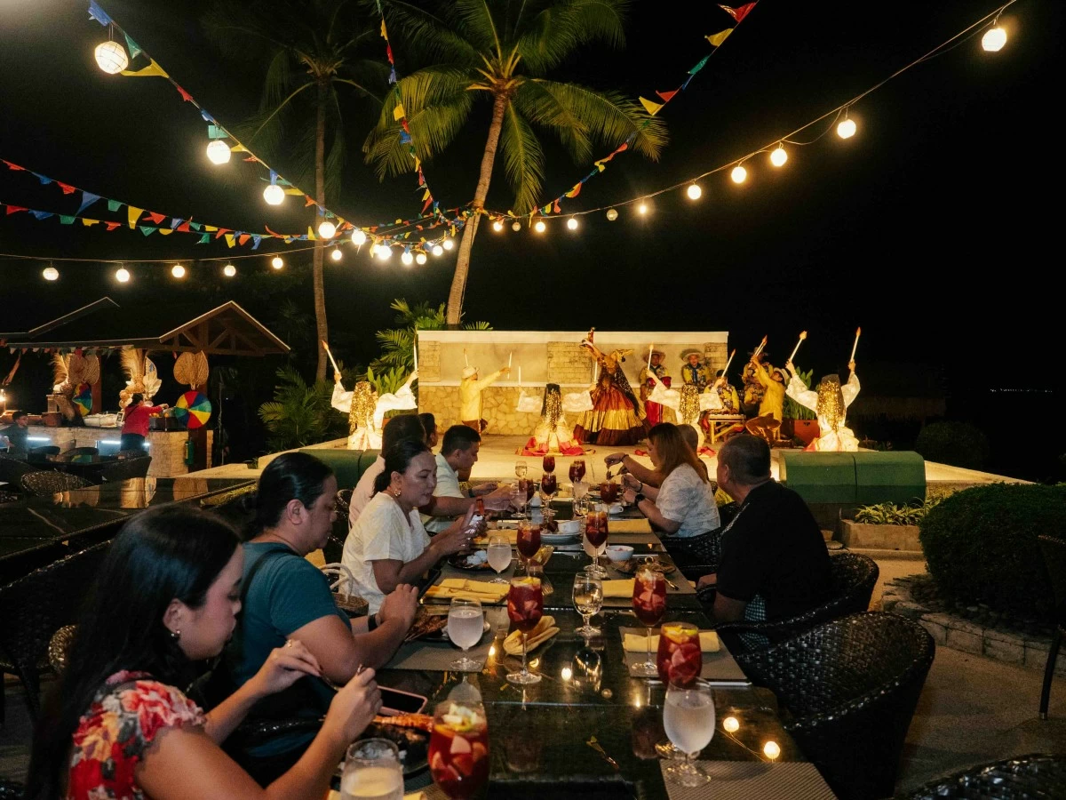The tempo shifted at Buko Bar, where a Filipino buffet was paired with cultural performances under open sky. Grilled meats, local stews, and sweets familiar to the palate sat beside dancers in bright costume. At Breeze, light snacks and tropical cocktails faced the beach, the salt air mingling with citrus and rum. In the Lobby Lounge, afternoon tea stretched toward dusk with scones and savories, and as night fell, cocktails were poured against views of the garden and pool.