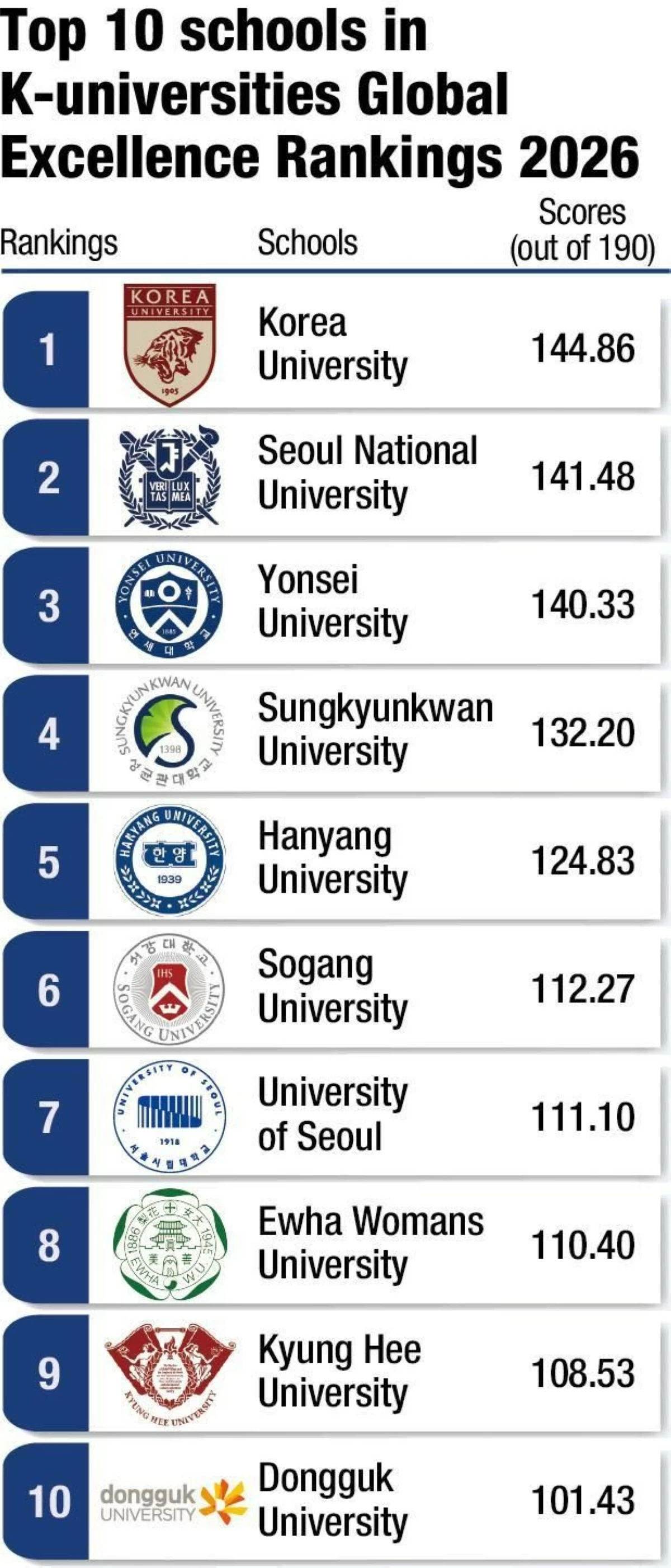 Against this backdrop, The Korea Times launched the K-universities Global Excellence Rankings, a first-of-its-kind assessment designed to reflect the realities of a globalizing campus environment. The rankings for 2026 are based on a broad set of indicators, with particular weight given to factors that matter most to international students, including diversity of nationality, scholarships, dormitory capacity and academic retention.