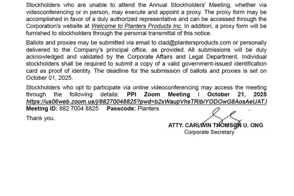 Planters Products, Inc. will conduct its Annual Meeting of Stockholders on Tuesday, October 21, 2025, at 2:00 P.M., at the PPI principal office, located at 109 Esteban Street, Legaspi Village, Barangay San Lorenzo, Makati City, or via Zoom videoconference.