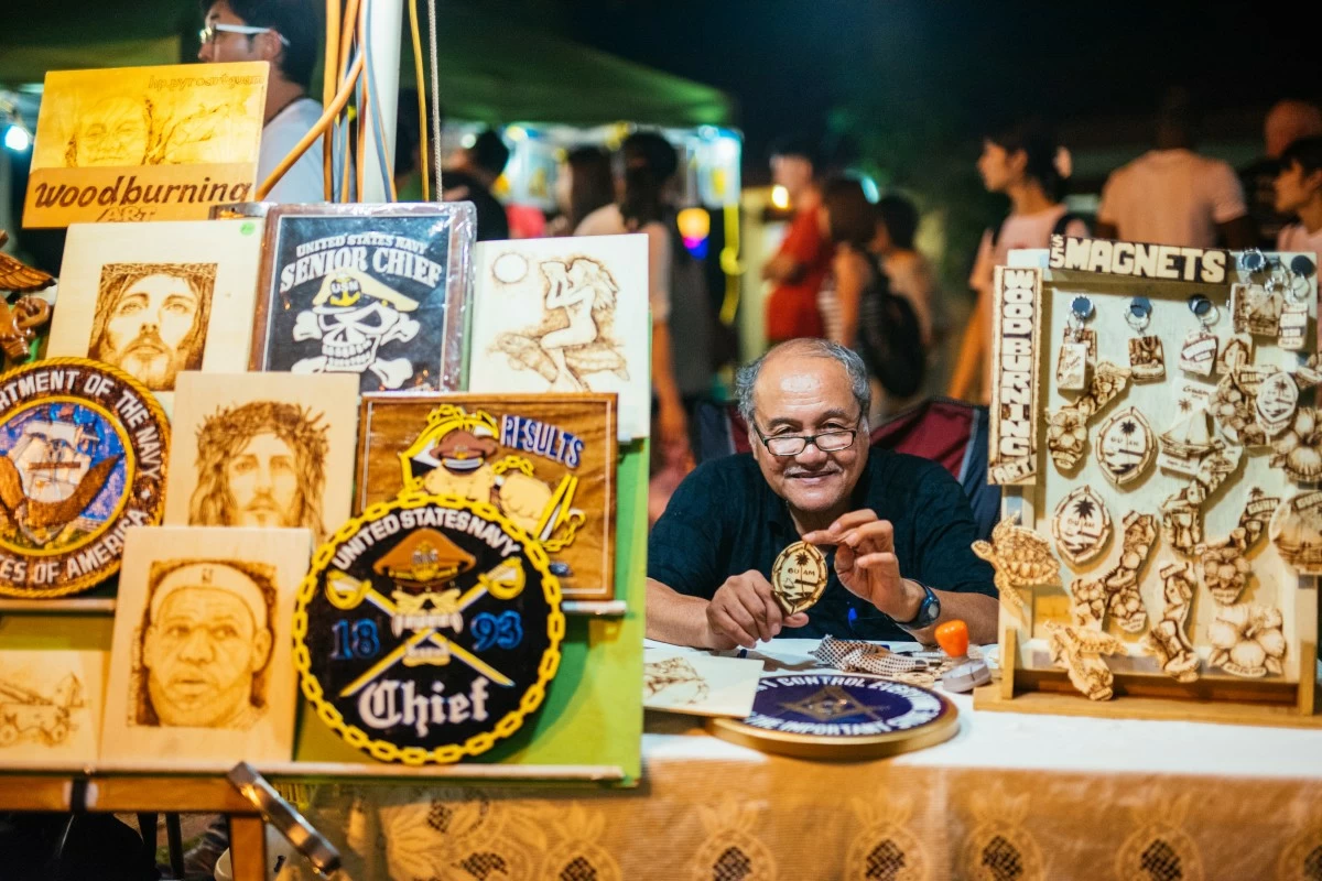There are food stalls offering barbecue with red rice, mango shakes, empanadas, and freshly grilled fish. For pasalubong, this is where one can find keepsakes with meaning: sinåhi necklaces carved from shells, Ifit wood carvings, and handmade bags and jewelry.