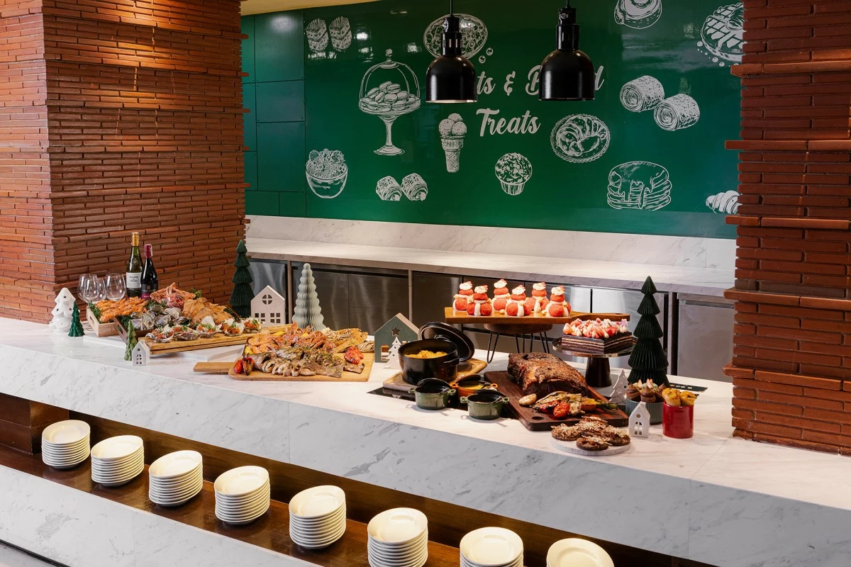 At Café 1228, guests can indulge in holiday buffets featuring festive favorites. From Christmas Eve to New Year’s Day, the restaurant offers a rotating menu of comforting classics and celebratory dishes, with prices starting at Php 3,800 per person. Children can join the feast at a special rate, and all meals include free-flowing beverages to toast the season.