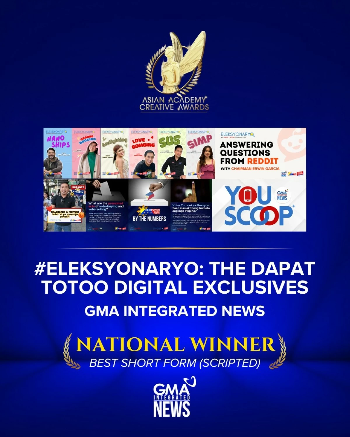 Scoring back-to-back wins is GMA Integrated News (GMAIN). Its innovative election campaign "Eleksyonaryo: The Dapat Totoo Digital Exclusives" produced by GMAIN Social Media; and "DigiDokyu: The Rice God of the Cordillera" produced by GMAIN – Digital Strategy and Innovation Lab were recognized for Best Short Form (Scripted) and Best Short Form (Unscripted), respectively.