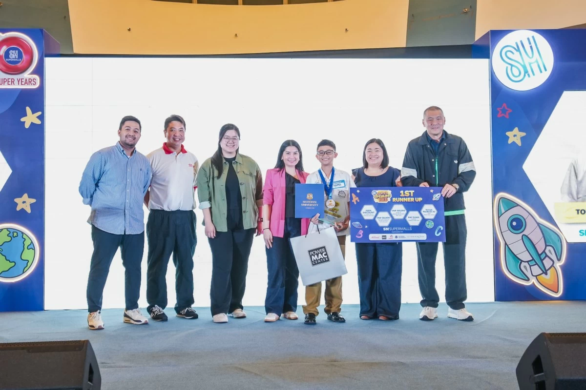 After three gruelling rounds, Jamver Mallari of SM City Legazpi was awarded the 2025 SM Super Spelling Bee grand winner.( From left): Power Mac Center assistant marketing manager Miguel Carpio, National Book Store president Adrian Ramos, SM Supermalls assistant vice president for Marketing and Leasing Hanna Carinna T. Sy, National University senior director for Business Development and Linkages Dr. Shainne Hostalero, Jamver Mallari, Power Mac Center senior Business Development manager Niña Rodriguez, and SM Supermalls executive vice president for Marketing Joaquin San Agustin.