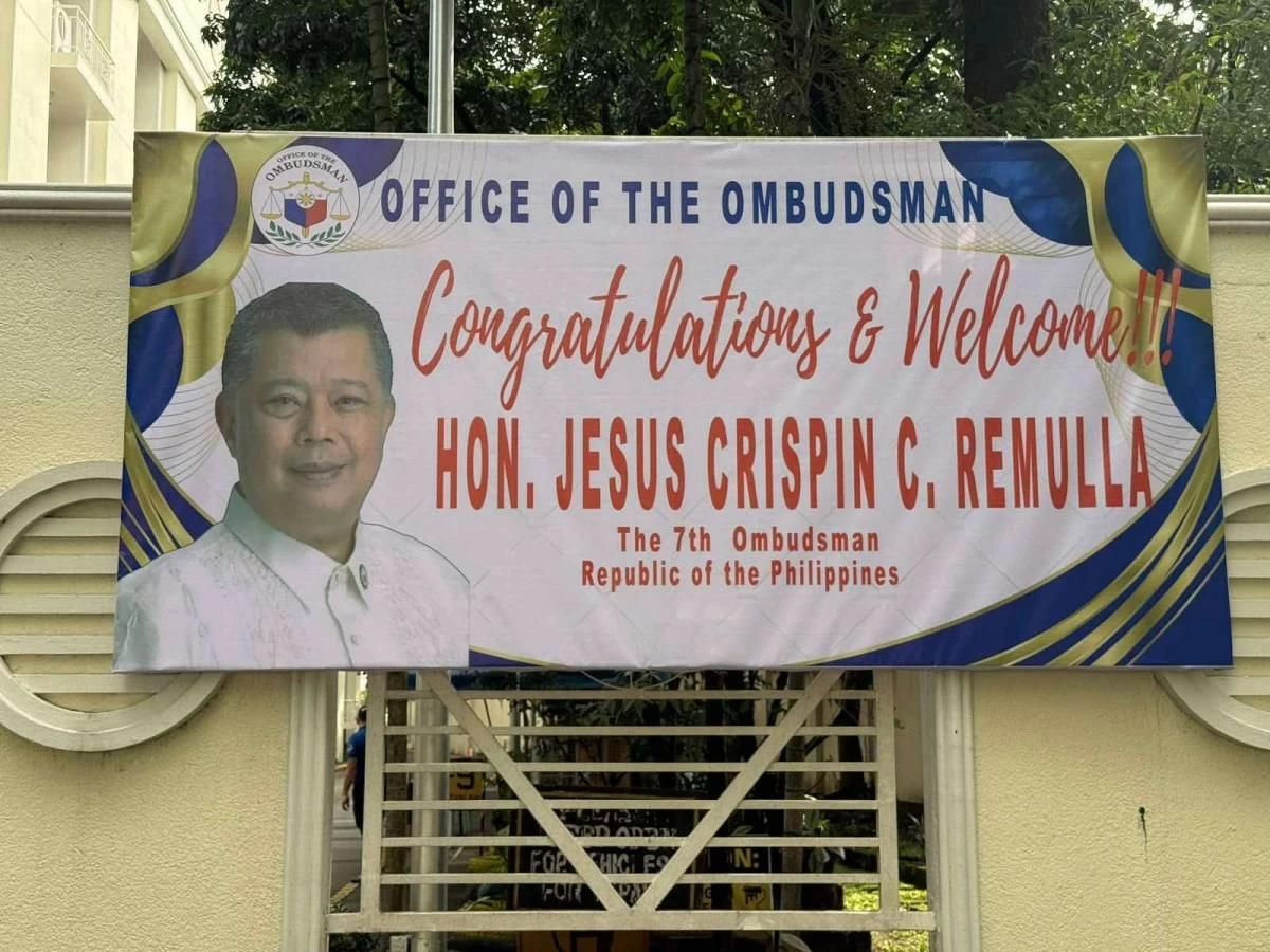 Outside the OMB’s office in Agham Road, Quezon City, a tarpaulin bearing the face of the former Department of Justice (DOJ) Secretary Remulla had just been put up on Wednesday morning with the message: "Congratulations & Welcome! Hon. Jesus Crispin C. Remulla."