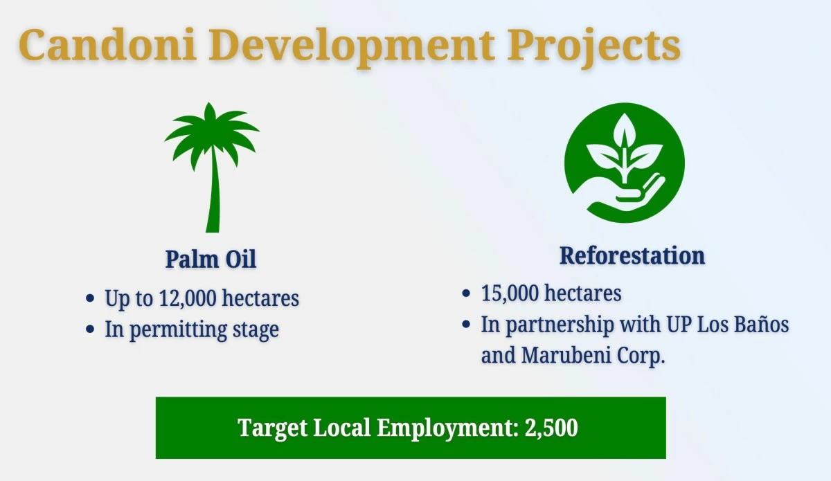 “This is for carbon credits. And, if it succeeds, we intend to go up to 100,000 hectares in areas that were denuded,” he said, adding that, “Between the plantation and reforestation projects, the workforce in Candoni could reach around 2,500 people.”