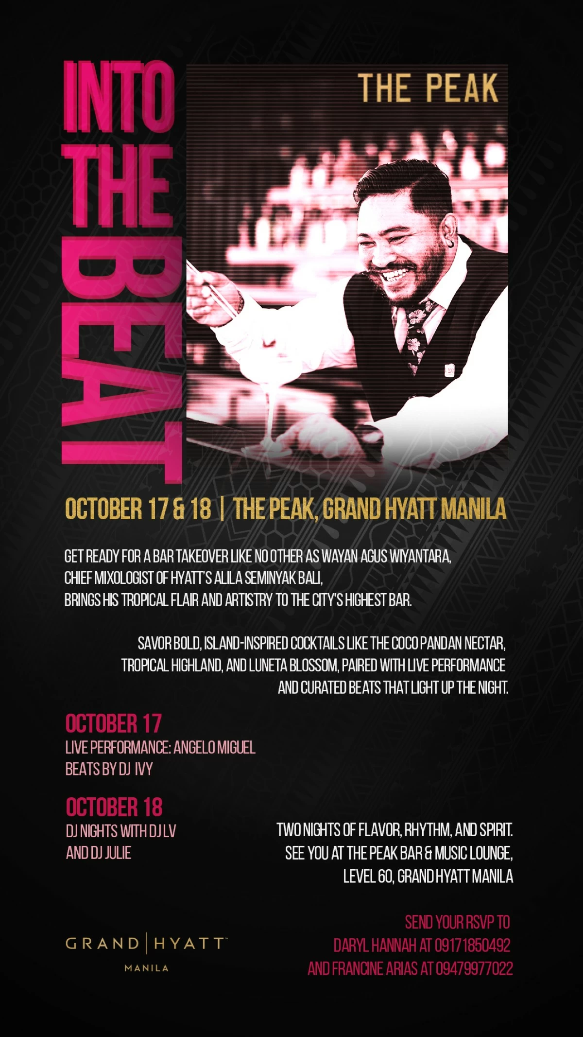 “We’re thrilled to host Wayan Agus Wiyantara at The Peak,” said Mark Hagan, food and beverage director at Grand Hyatt Manila. “His commitment to sustainability and his imaginative style bring a fresh perspective to our bar program and offer our guests a truly memorable experience.”