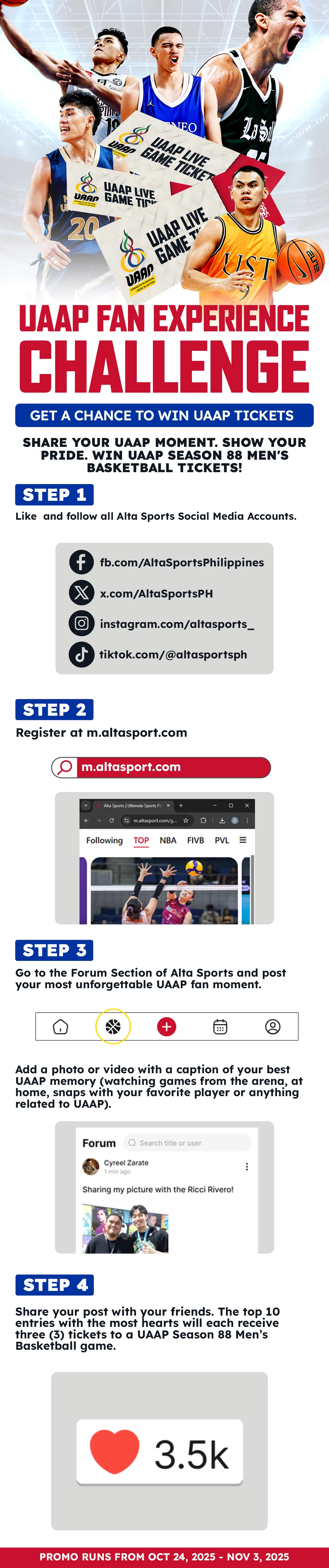 Through the UAAP Fan Experience Challenge, fans can win tickets by following and posting their most memorable UAAP experience, whether an unforgettable story or a throwback photo with their favorite UAAP legends, in the Forum Section of the Alta Sports App from October 24 to October 31.