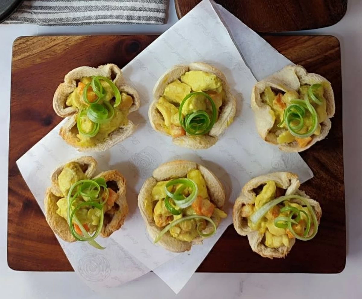 For Kel’s Kitchen’s Chicken Curry Pot Pies, softness is king as she shapes Gardenia slices to take the place of the usual pastry crust. The bread cups hold luscious chicken curry simmered with potatoes, carrots, and garbanzos in creamy spice; making an ideal warm dish for rainy or cold days.