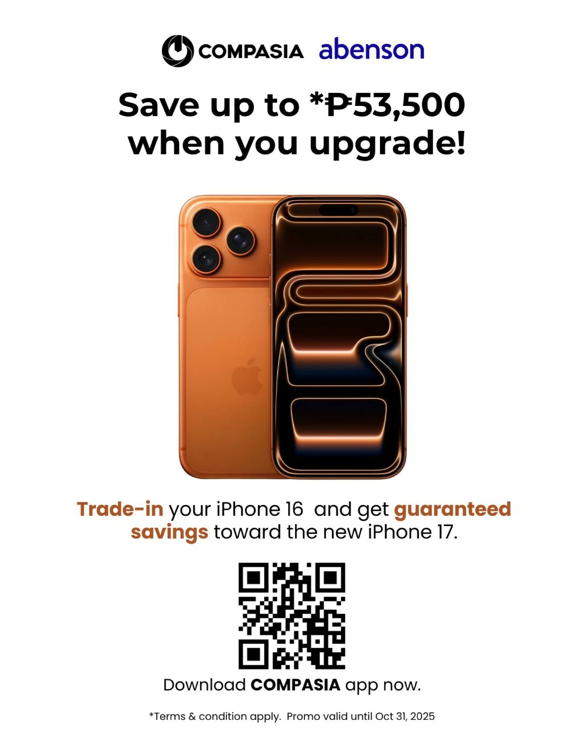 Through our exciting partnership with Comp Asia, we’re supporting customers’ budgets and the environment. Trade in your old iPhone 16 at any Abenson store and enjoy up to P53,500off when upgrading to the iPhone 17 with CompAsia.