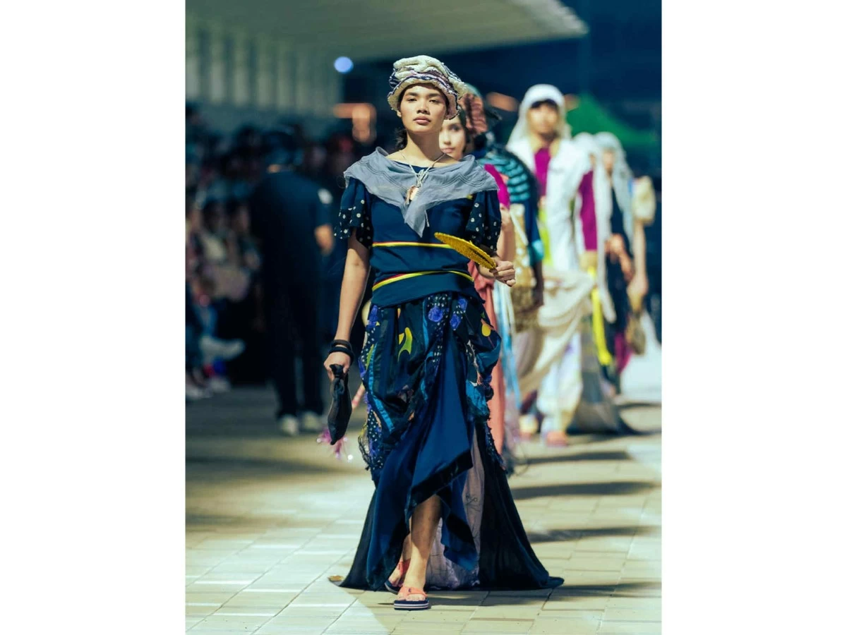 The idea of games and gambits is the central theme of Oriental Mindoro–hailed designer Glyn Alley Magtibay’s collection. Her creative process started with intramurals as inspiration, particularly the muses and ace players. A highlight of her collection is a kimono ensemble that mirrors a game of chess. Another is a barong look adorned with stitching details reminiscent of a baseball seam. The collection incorporates piña, cotton, yakan, hablon, sport mesh, nylon taslan, and dry-fit fabric—making it a true medley of Filipino heritage and sports.