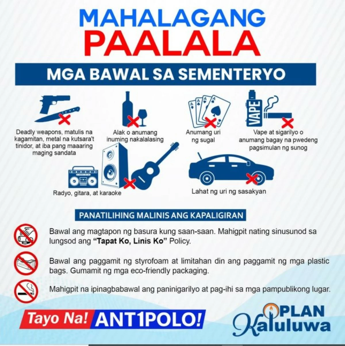 As always, the city government is reminding the public on the ban on bladed and deadly weapons, alcoholic beverages, gambling, smoking including use of vape; bringing of musical instruments including guitar and the use of speakers and sound systems; and entry of vehicles in non designated parking areas in and outside the cemeteries.