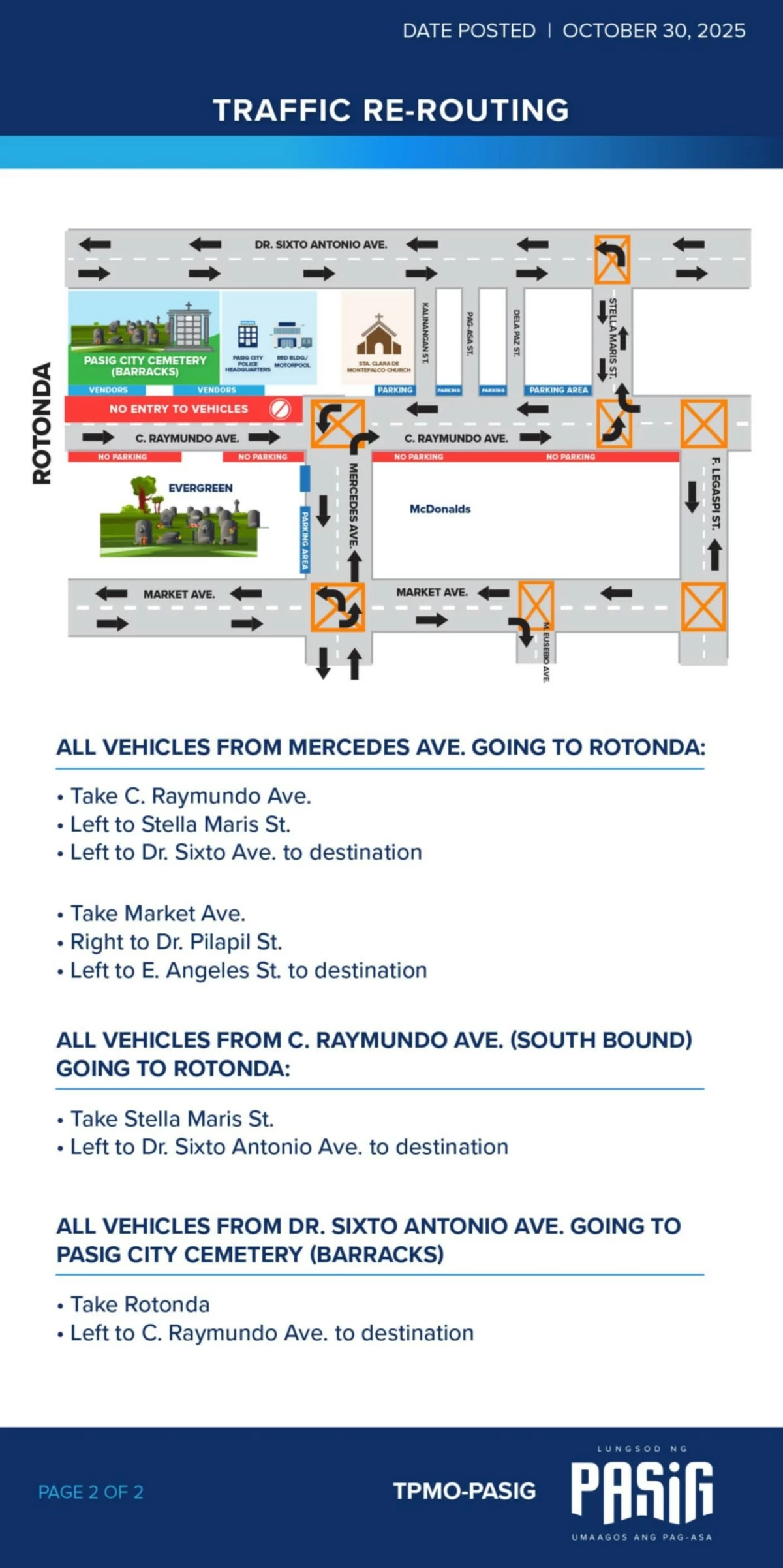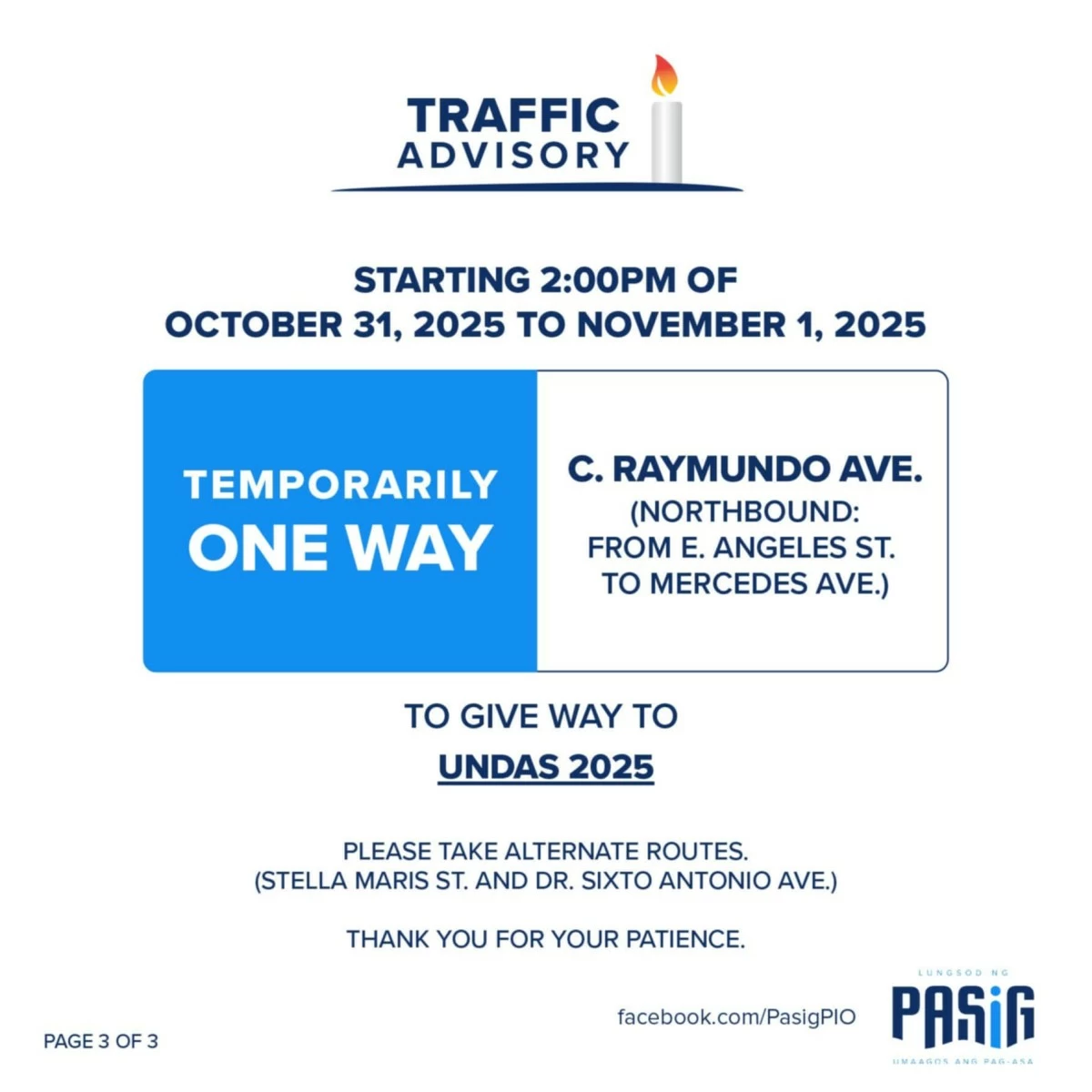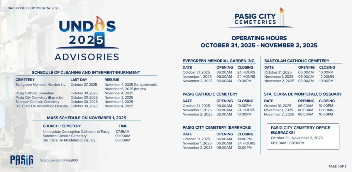 Meanwhile, to facilitate Undas 2025, the local government said that a temporary one-way scheme will be implemented along C. Raymundo Avenue (northbound from E. Angeles Street to Mercedes Avenue) starting at 2 p.m. on Oct. 31 until Nov. 1.