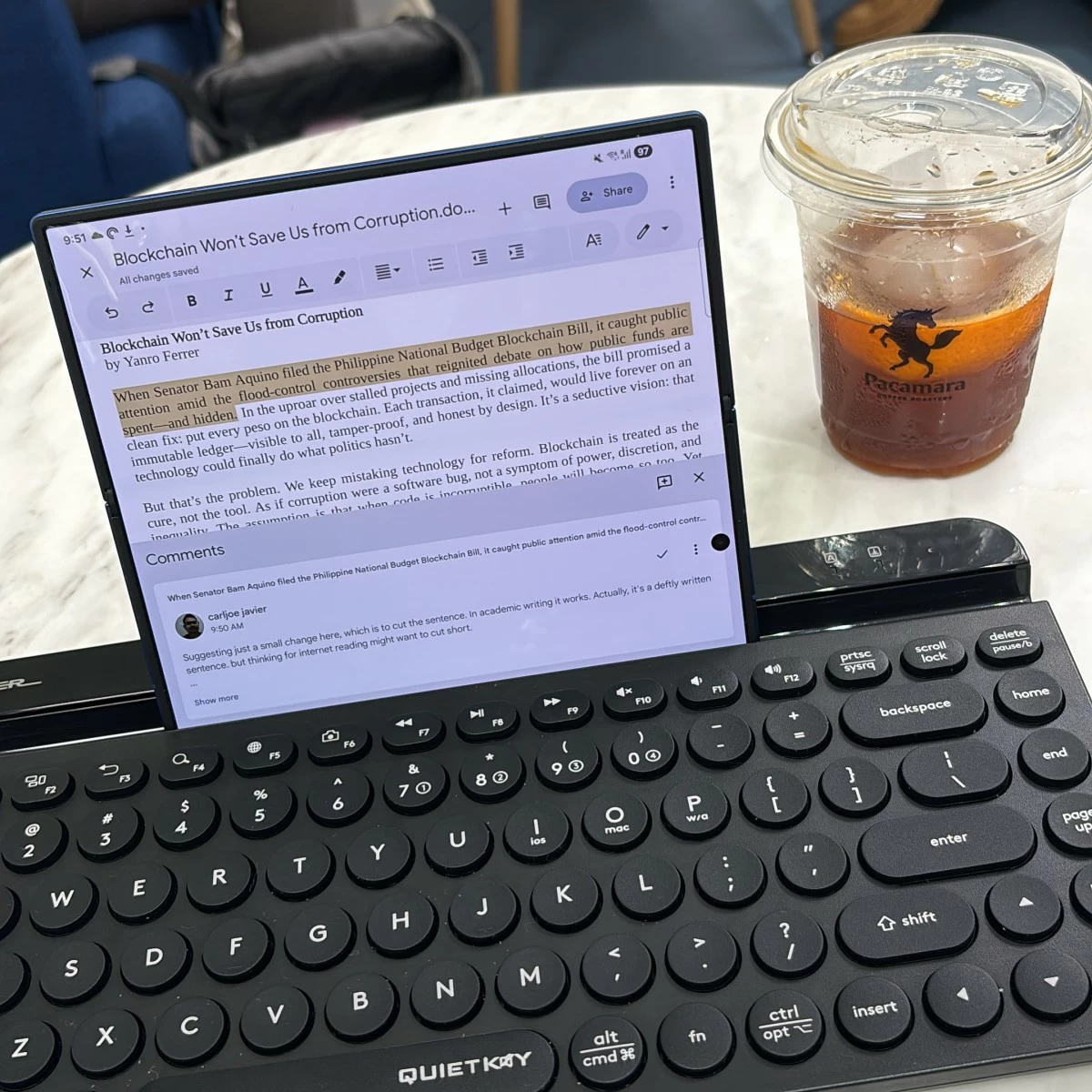 To test if the Z Fold7 could indeed be a do-everything device, I took it on a weeklong trip abroad. It felt extreme to leave my laptop, tablet, and Kindle at home. I brought a bluetooth keyboard with a slot to stand the phone in. The trip involved media coverage of a conference. I loved switching from full screen version + keyboard to take notes during interviews, to folding it back into slab to take pictures, and then back and forth depending on the needs of the moment and the space available. There were some browser-based work apps that I kind of struggled with, but I’m not sure if it’s a problem with the phone or the app design. But on the whole, it handled everything I threw at it with relative ease.