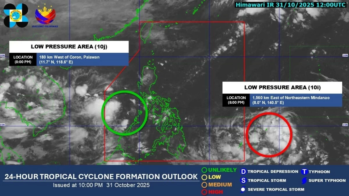 “As of 8 p.m. today, 31 October 2025, a Low-Pressure Area (LPA 10j) is being monitored inside the Philippine Area of Responsibility (PAR) and is unlikely to develop into a tropical depression within the next 24 hours,” PAGASA said.