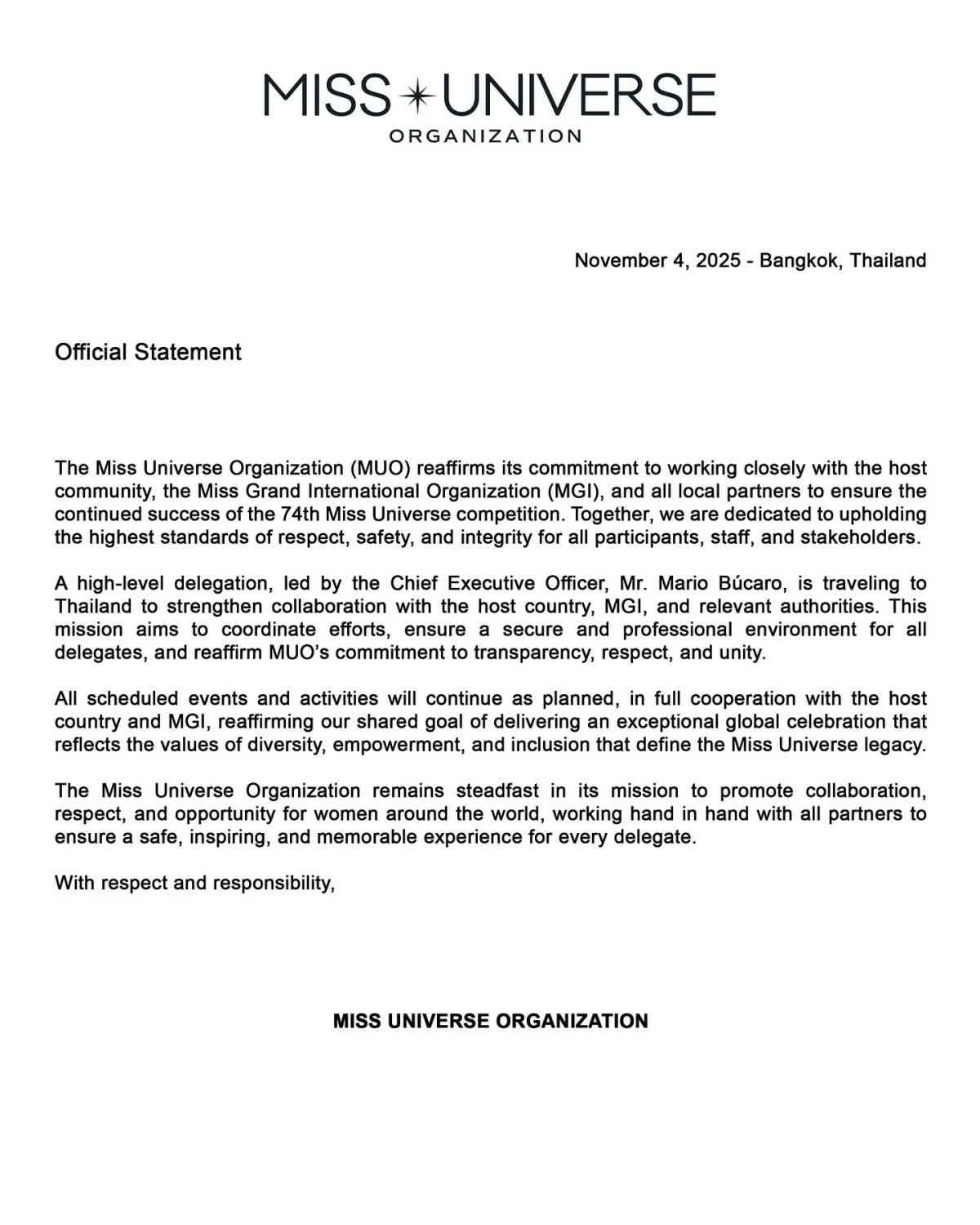 In a fresh statement on Nov. 4, the MUO reaffirmed its commitment to working closely with the host community, the Miss Grand International Organization (MGI), and all local partners to ensure the continued success of the 74th Miss Universe competition.