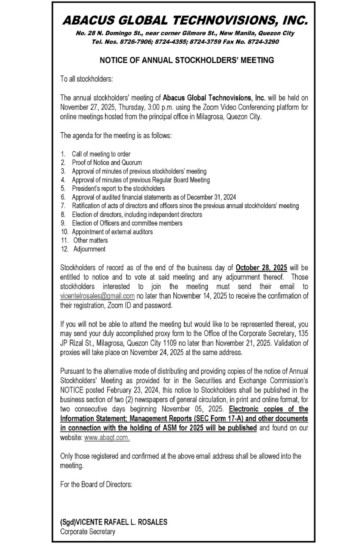 Abacus Global Technovisions, Inc. will hold its annual meeting of stockholders on November 27, 2025, Thursday at 3:00 p.m., via the Zoom video conferencing platform, hosted from the principal office in Milagrosa, Quezon City.