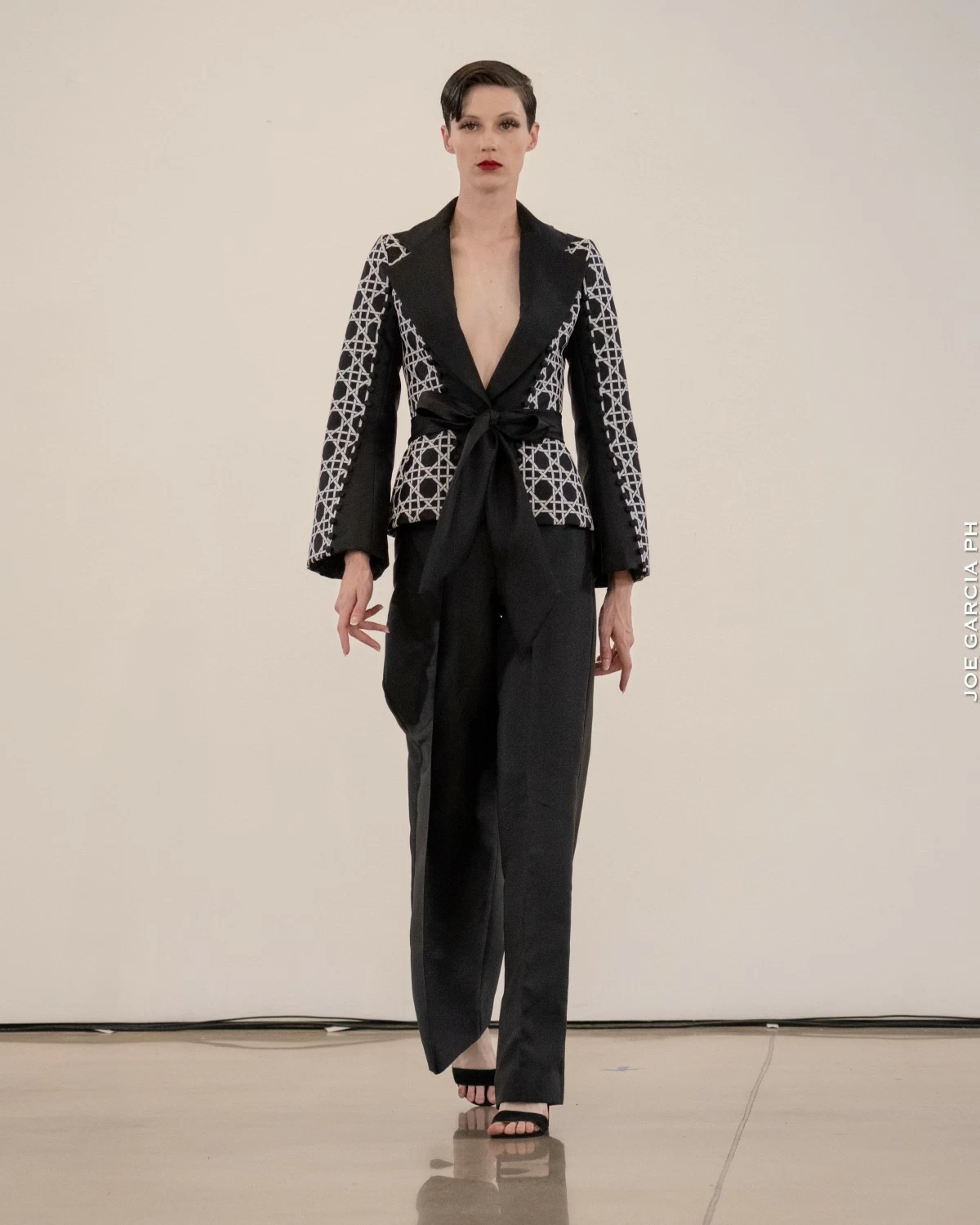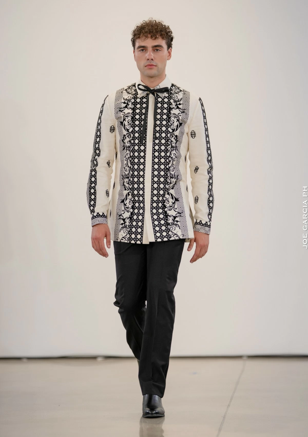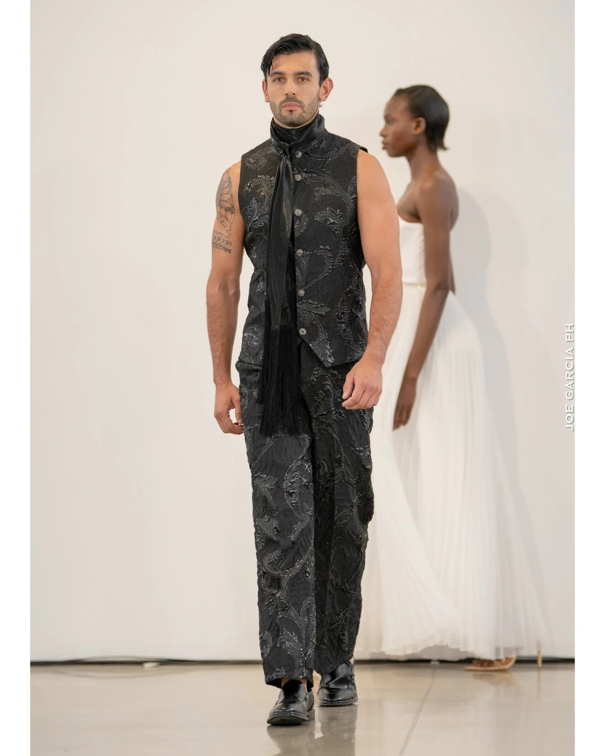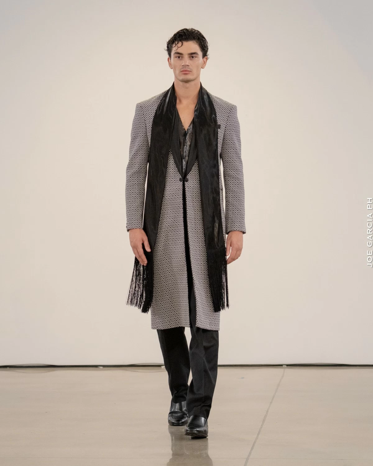 For his men’s looks, the designer presented matching black and silver brocade pants and jackets, black brocade pants and vest paired with a black beaded jacket, an eco piña (pineapple fiber) shirt, and a brocade overcoat paired with a fringed scarf.