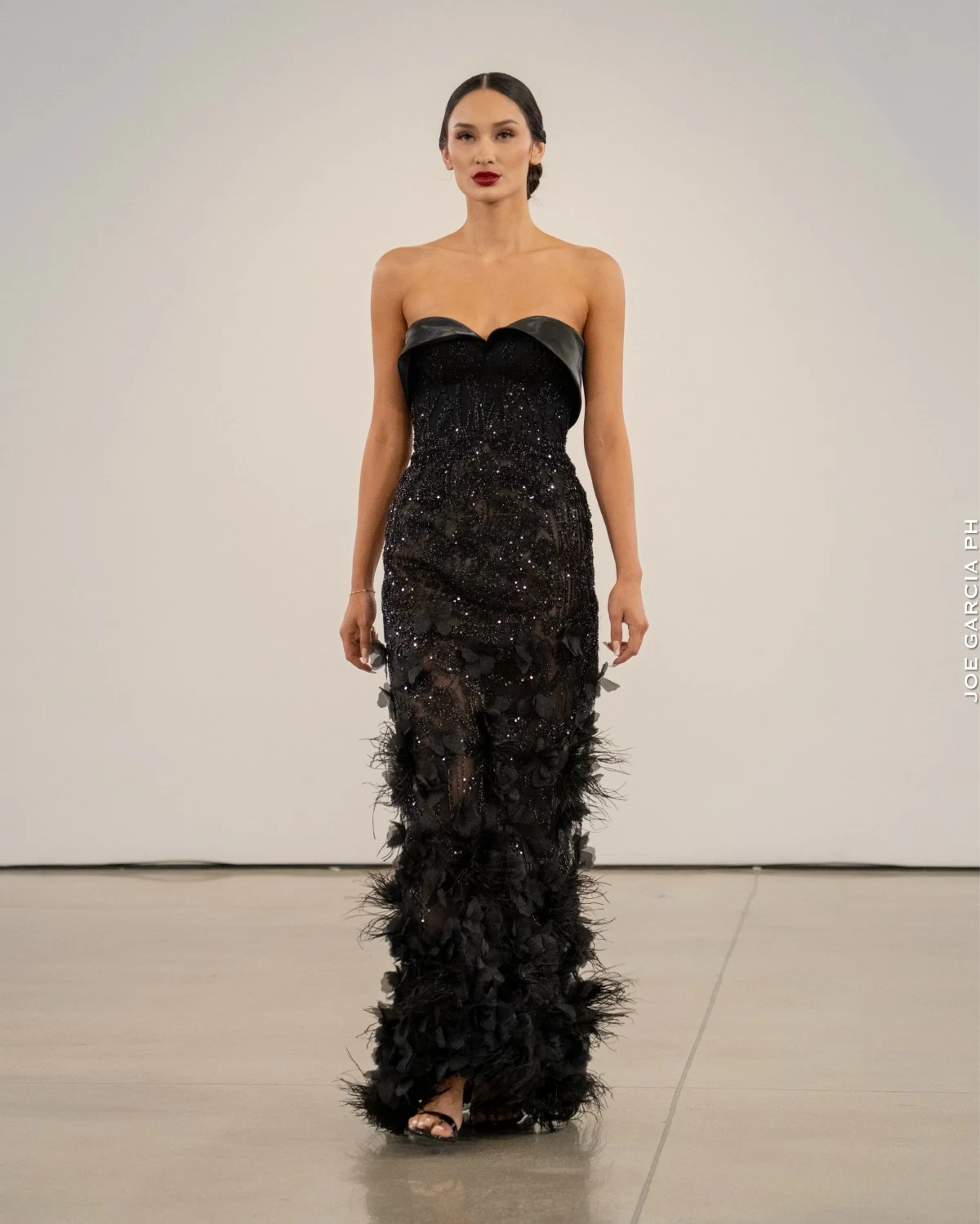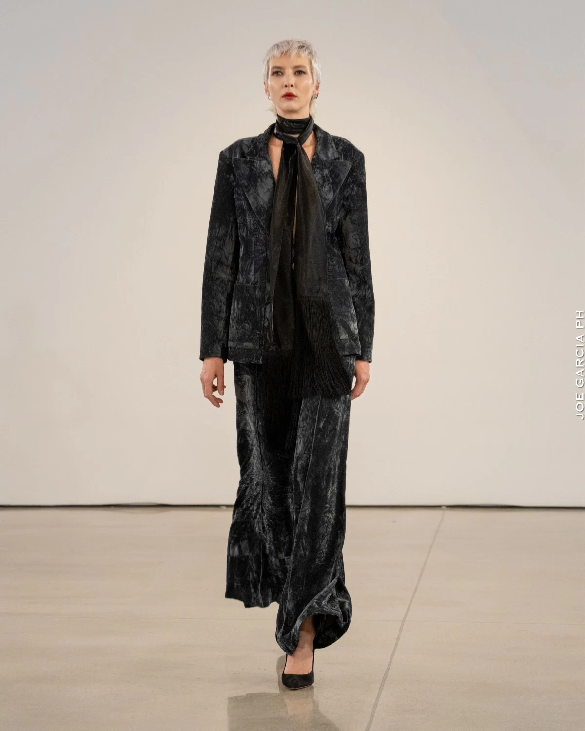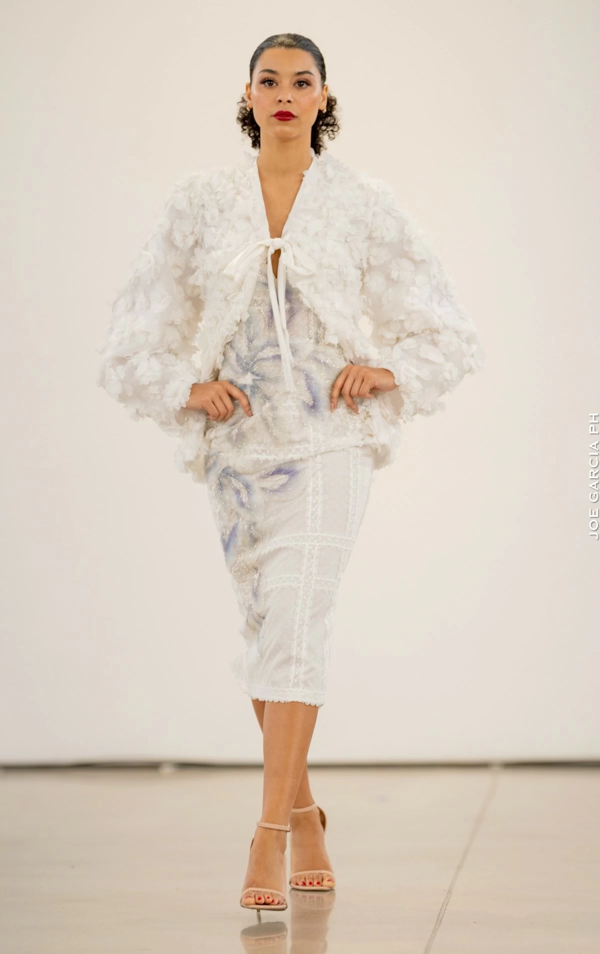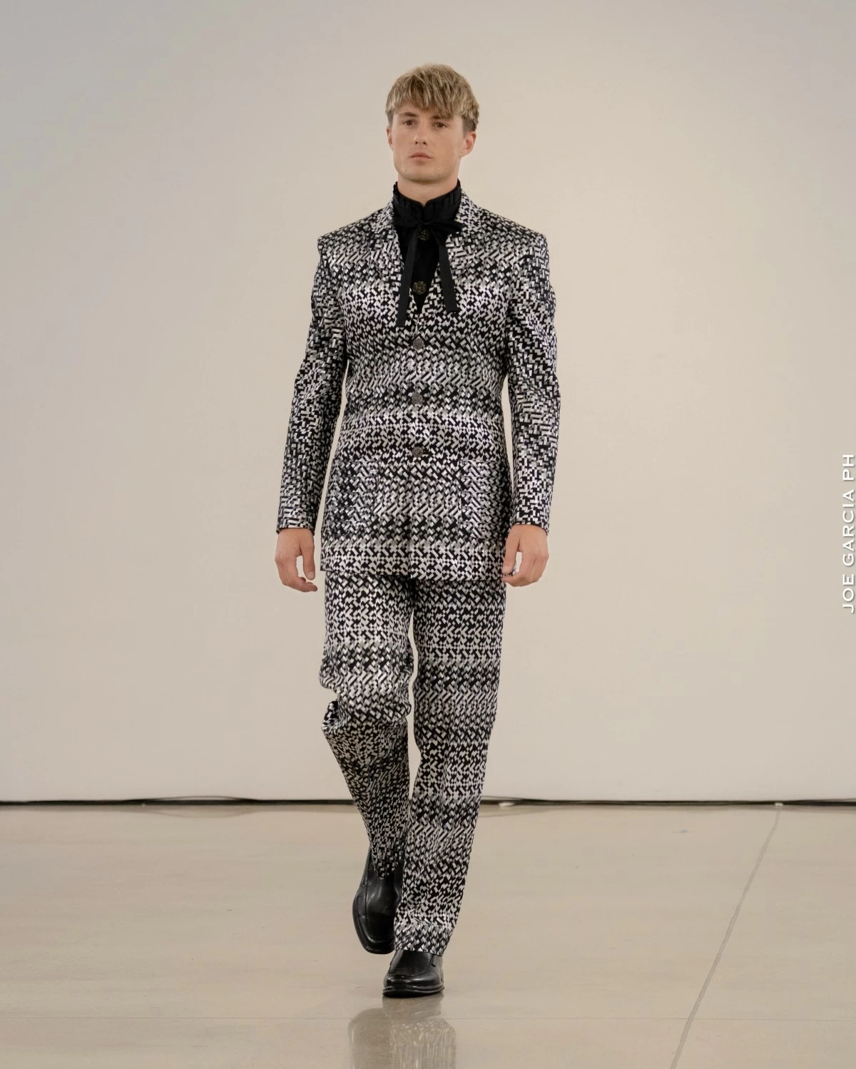 For his men’s looks, the designer presented matching black and silver brocade pants and jackets, black brocade pants and vest paired with a black beaded jacket, an eco piña (pineapple fiber) shirt, and a brocade overcoat paired with a fringed scarf.