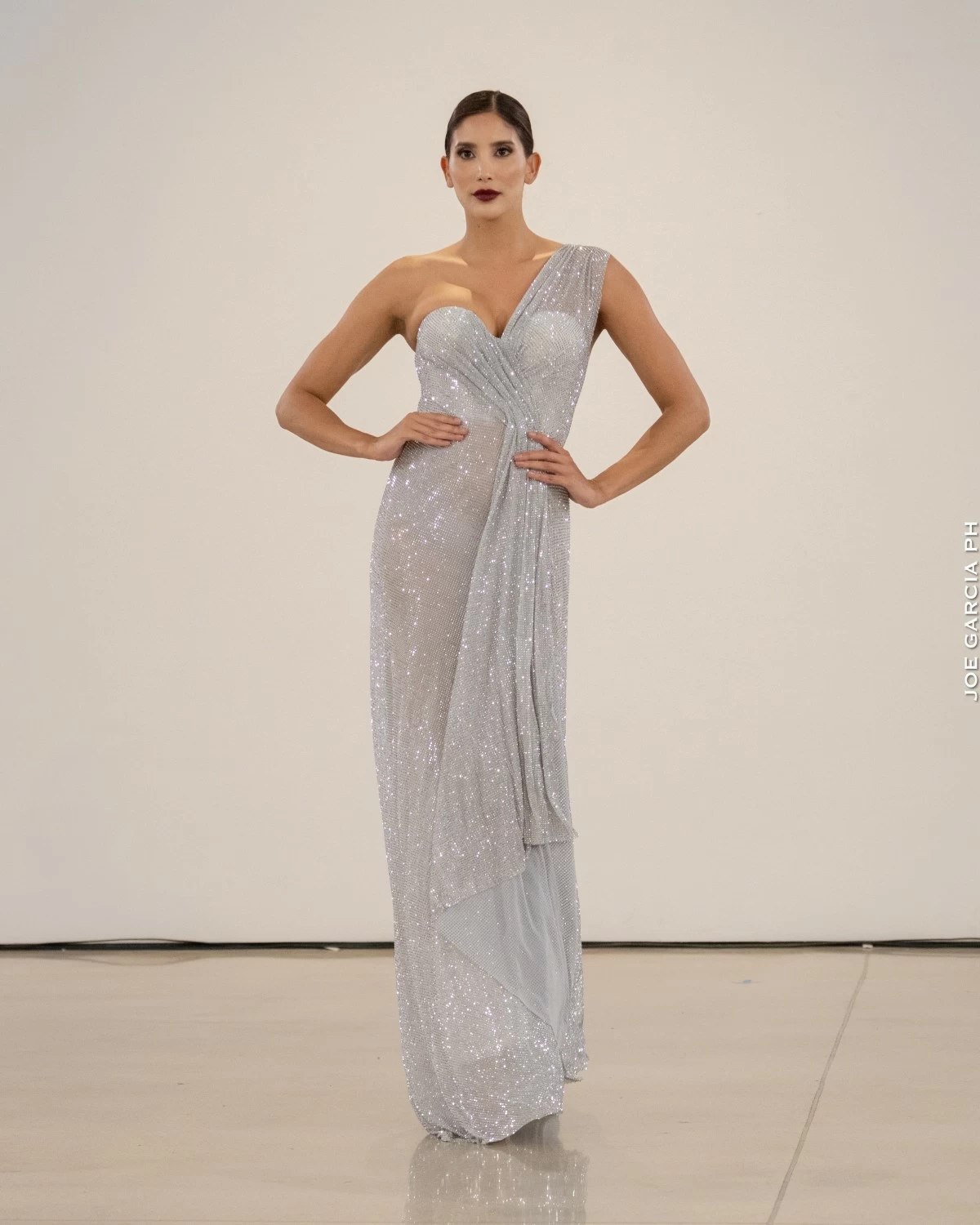 The women’s pieces featured a combination of hand-embellished gowns, dresses, and tailored pantsuits. The gowns and cocktail dresses predominantly highlighted Roman goddess–inspired flowing silhouettes, with bodices adorned in sequins, chainmail, rhinestones, rosettes, and ostrich feathers. Several structured mini dresses were also presented, accented with rhinestone draping.