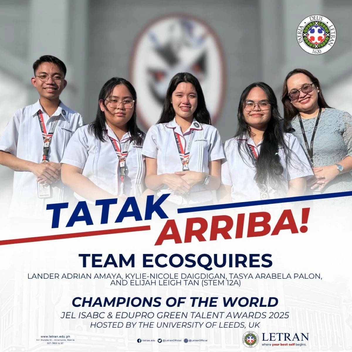 A group of STEM senior high school students from Colegio de San Juan de Letran - Manila won the top award at the JEL ISABC & EduPro Green Talent Awards 2025 held at the University of Leeds, United Kingdom, earning the title Champion of the World for their sustainability project EcoCycle.
