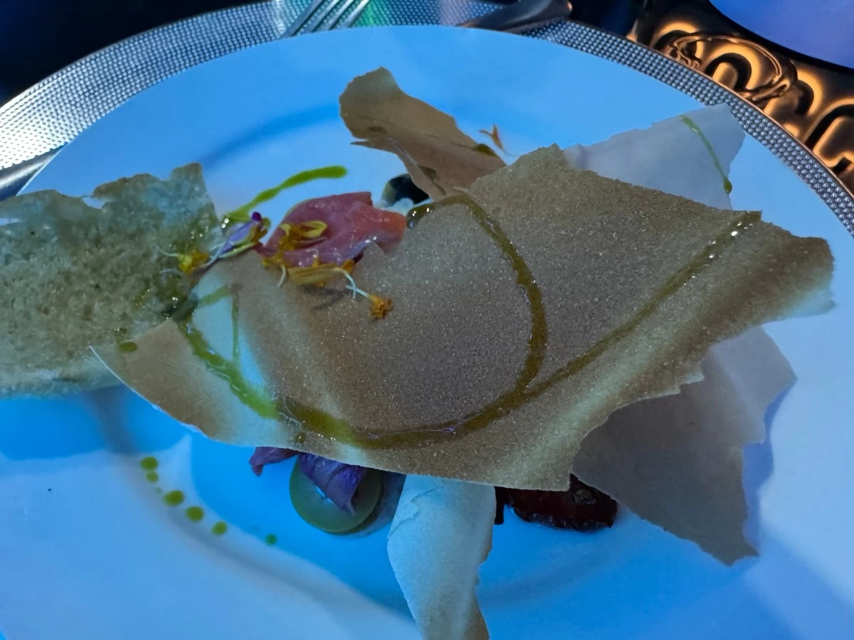 Two expressions of crudo followed. Salmon and beets crudo brought brightness, restrained and chilled, while salmon gravlax leaned deeper into brine and fat. Buffalo burrata softened each bite, sun dried tomato delivered acidity. The olive tonnato tapenade was the bridge, salty and anchovy forward, and best scooped with sourdough lavash or torn focaccia for contrast.