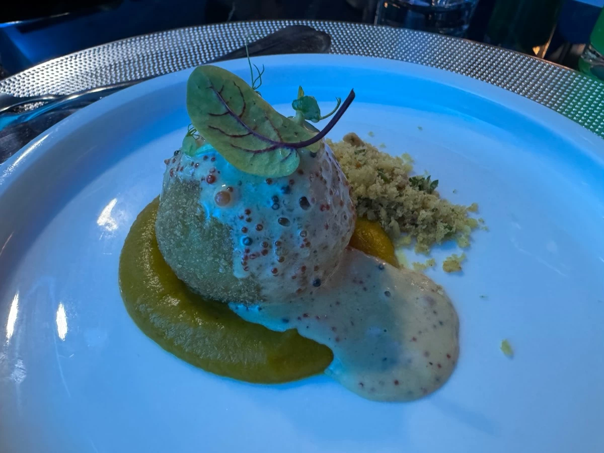 Dinner opened with Truffle Formaggio Arancini, crisp shelled and risotto soft at the core. The Arborio grains remained distinct, held together by generous cheese and truffle. Burnt milk espuma added lightness, tahini duko gave nuttiness, while a smooth squash purée grounded everything in soft sweetness. It was the kind of plate that arrived quietly then lingered.