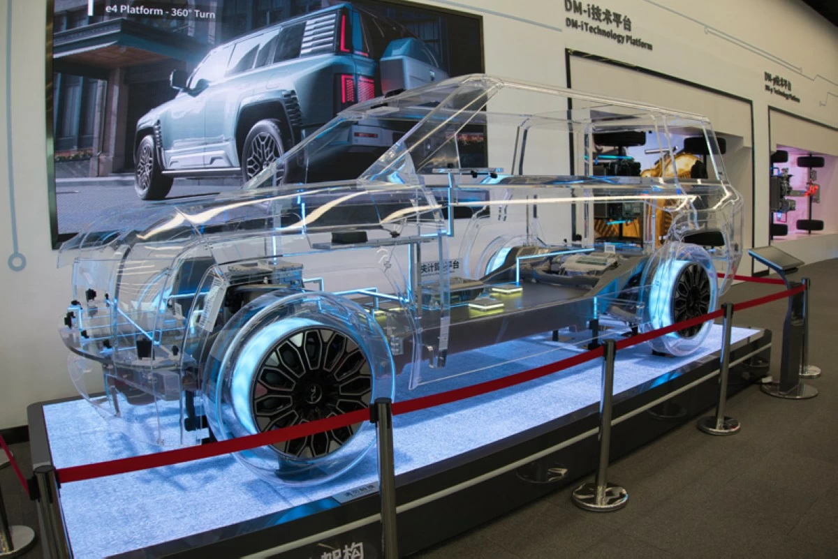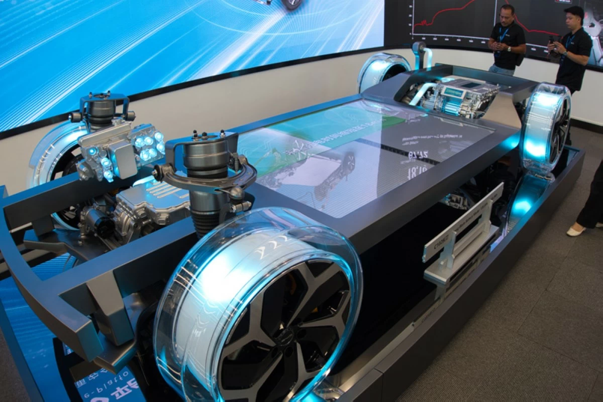 Wang walked us through what BYD calls its "Technology Pool Zone." Blade Battery. DM 5.0, pioneering the 2-liter per 100-kilometer era. The Super e-Platform, which holds 11 world records, including charging rates that deliver 400 kilometers of range in five minutes. A new generation of 1500V SiC power chips. An e-motor that spins at 30,511 rpm, also a world record.