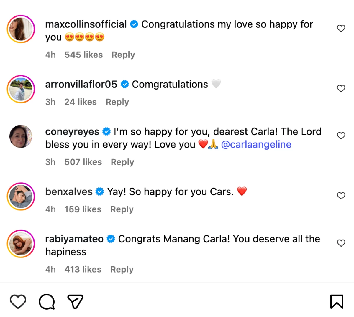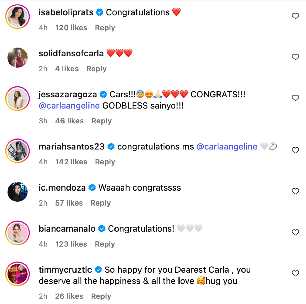 Celebrity friends and netizens congratulated Carla on her rumored engagement. Some comments: