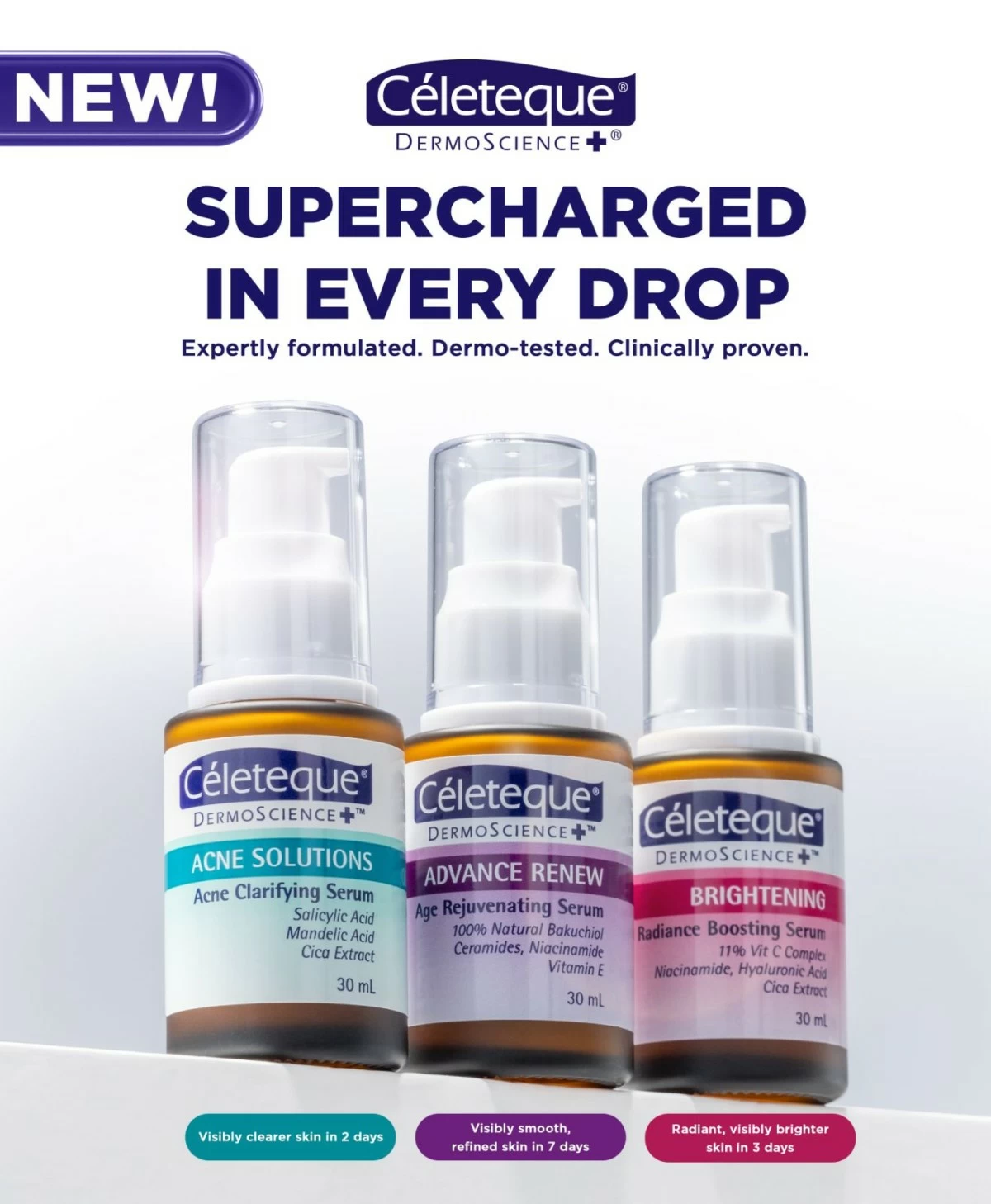The Celeteque Serums don’t just offer multiple potent ingredients; they are scientifically designed to optimize efficacy through thoroughly researched combinations of power actives. By finding complementary ingredients, it takes away the need for multiple single-targeted products and instead, offers you a solution that can help address problem areas in one go. #SuperchargedinEveryDrop, these serums use expert science to make sure you get the most out of the products.