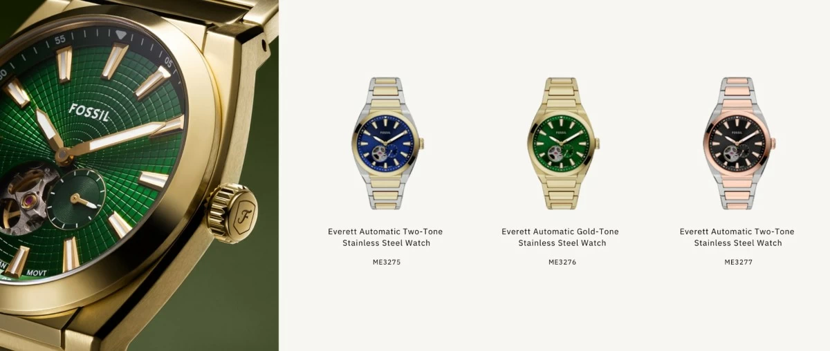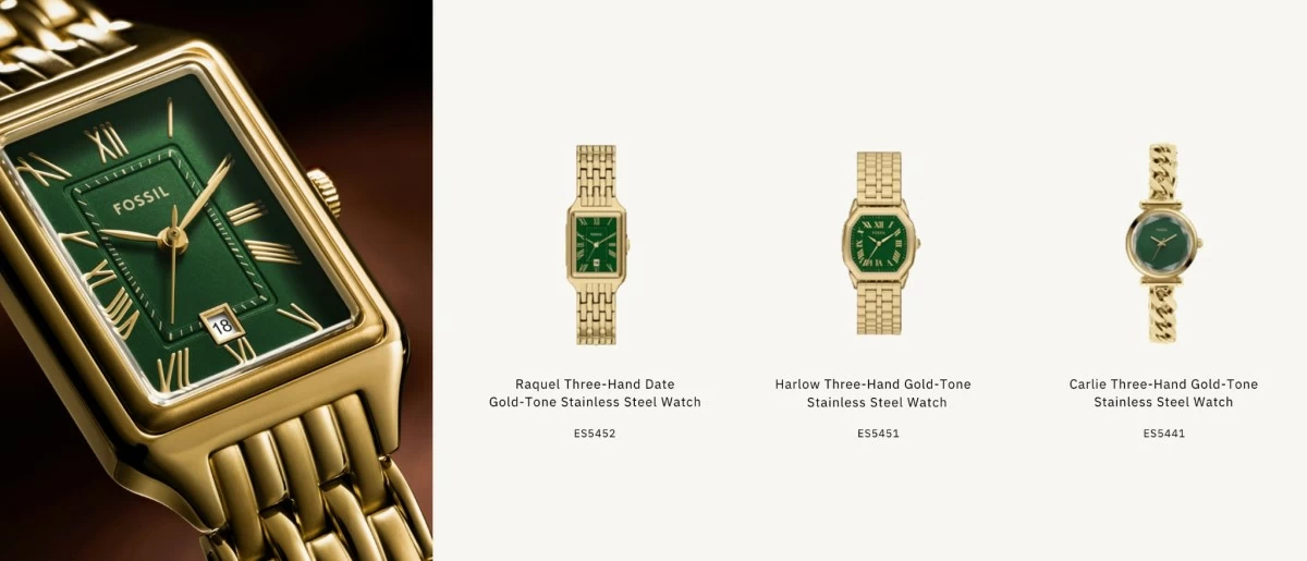Fossil’s bestselling profiles are refreshed in gold tones and festive greens—a color story that nods to the season while still blending easily into daily wardrobes. It’s celebratory, but never costume-like; fresh, but still familiar.
