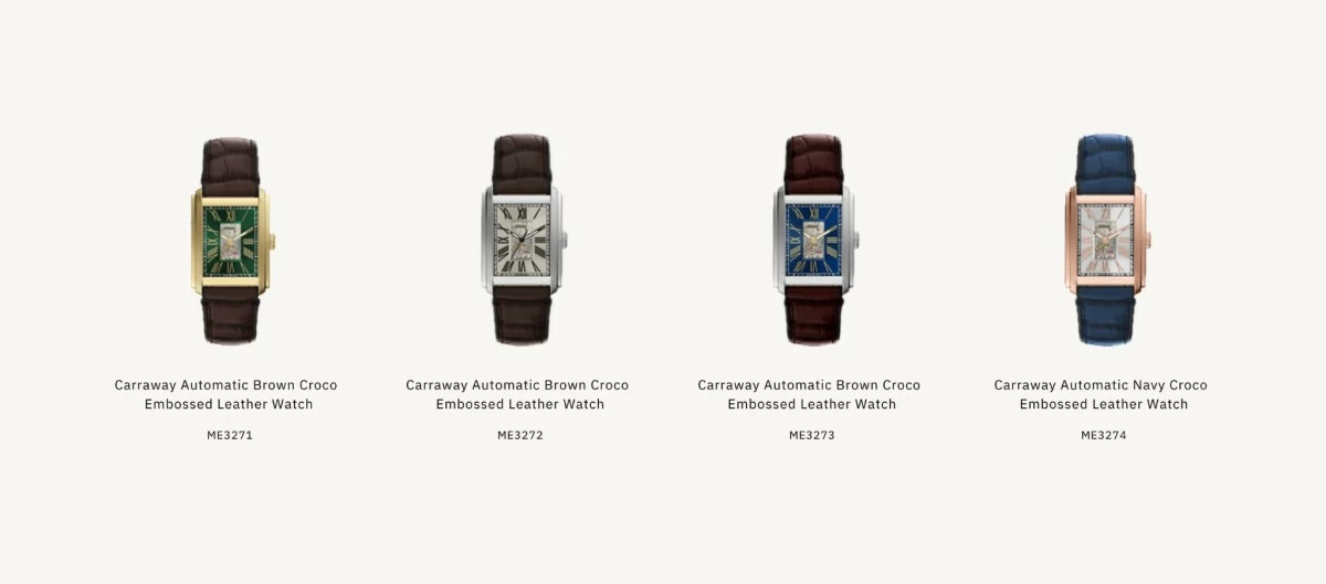 Carraway continues Fossil’s fascination with early 20th-century architecture—composed lines, sculptural structure, and a sense of clarity in form and function. The new Automatic version deepens this story with a skeletonized dial and croc-embossed leather strap, giving the watch a heritage feel that still reads modern.