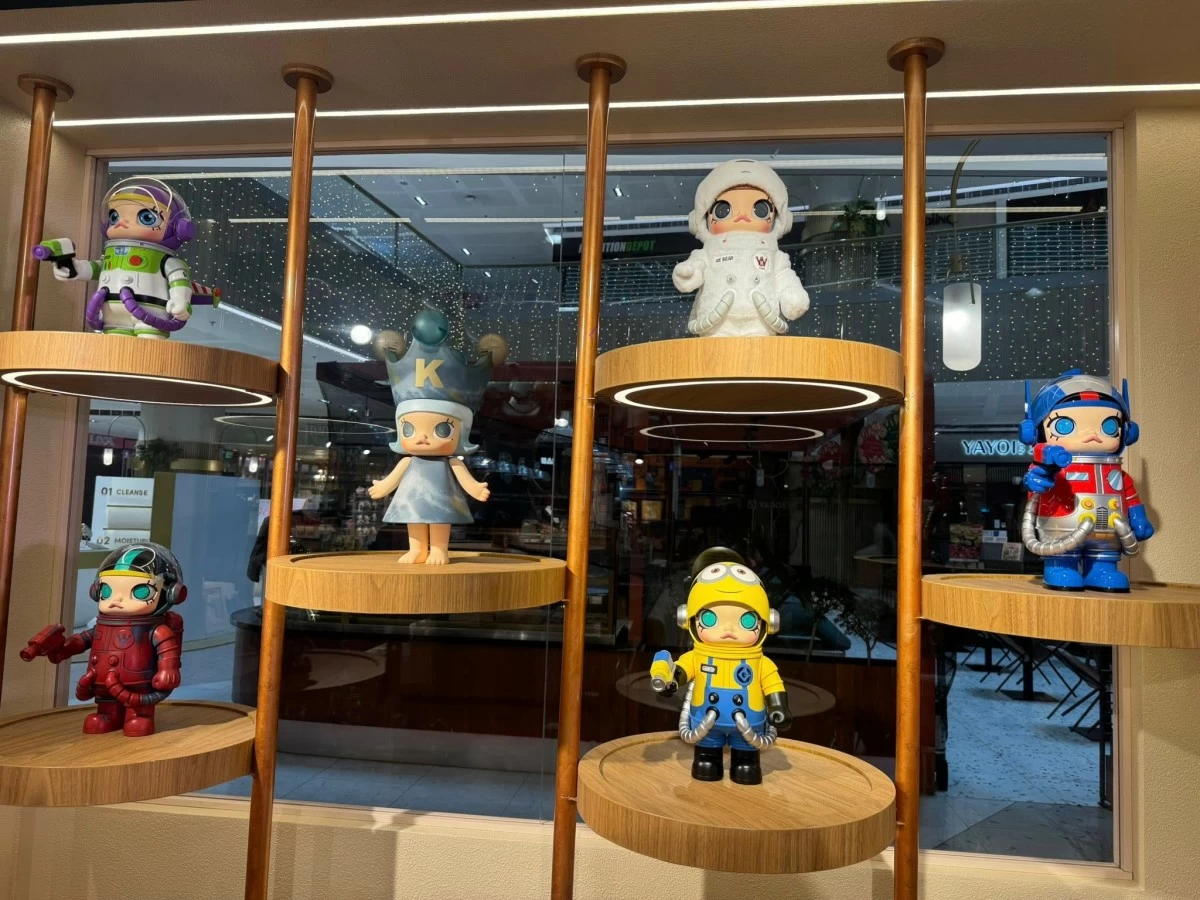 Visitors can explore exclusive drops, blind boxes, plush pendants, lifestyle items, and a wide assortment of fan-favorite characters. At the heart of the installation is the Pop Bean Coffee Factory Series, which blends the charm of Pop Mart’s characters with the whimsy of café life—from scented candles and pillows to handbags, badges, charms, and apparel-inspired accessories.