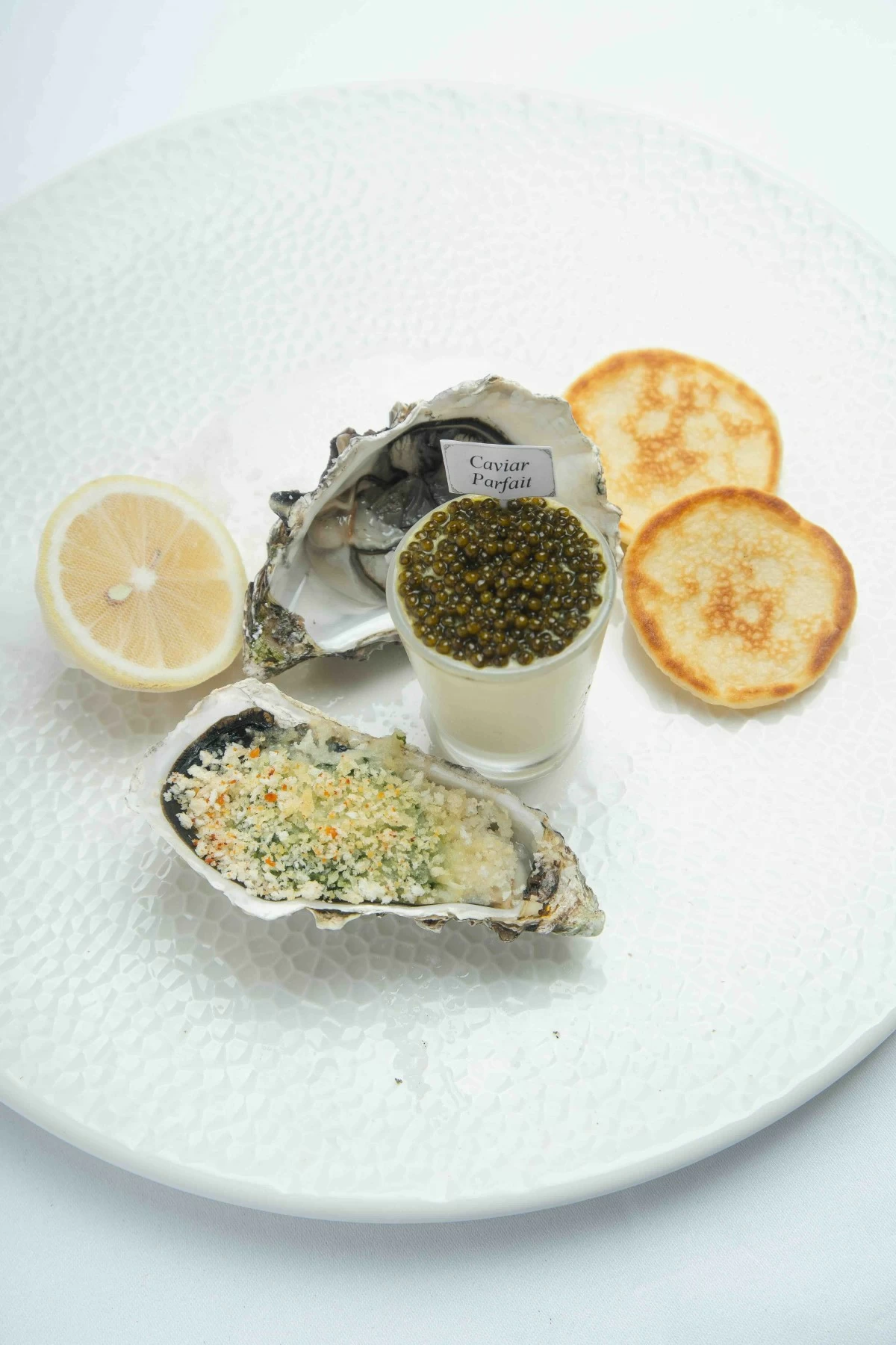 The menu extends beyond bread into classic French dishes meant for sharing and savoring. Among the offerings are Caviar Parfait with Blini, Fresh Oyster and Truffle Rockefeller, Salmon Mousse, Raclette, and Chicken Liver Pâté with Foie and Apple Compote. The dishes reflect French cooking that values richness tempered by restraint.