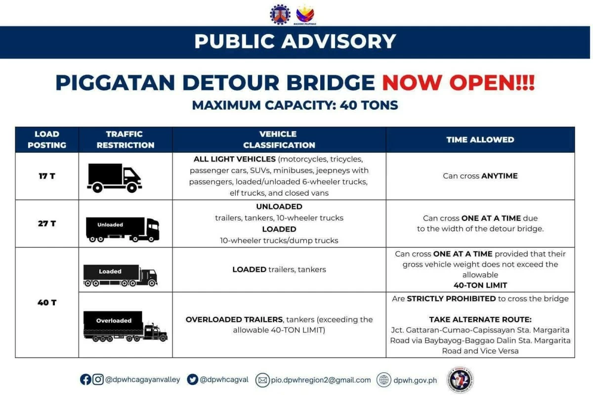 Vehicles weighing more than 40 tons were advised to take an alternate route – the Junction Gattaran-Cumao-Capissayan-Santa Margarita Road via Baybayog-Baggao-Dalin-Santa Margarita Road and vice versa.