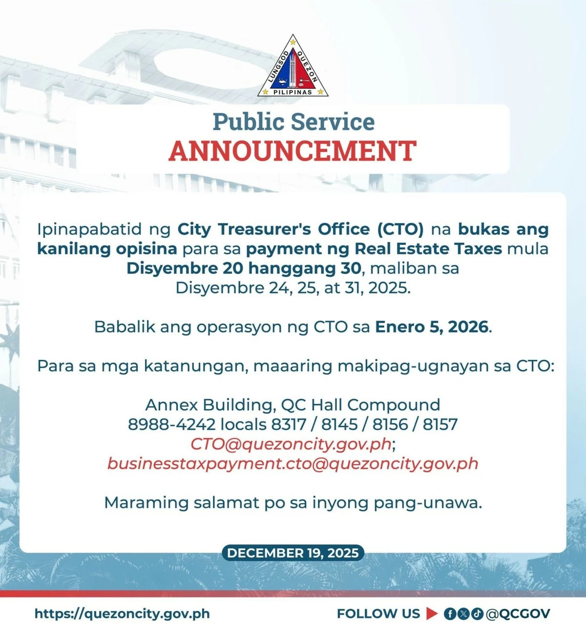 The Quezon City Treasurer’s Office (CTO) has announced on Friday, Dec. 19, that it will remain open to accept payments for real property or real estate taxes from Dec. 26 to 30,to accommodate taxpayers ahead of the year-end holidays.