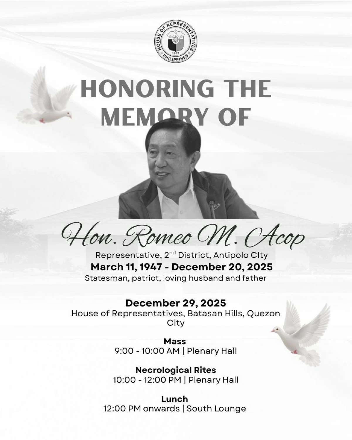 Dr. Philip “Bong” Acop, son of the late lawmaker and former Antipolo City councilor, confirmed that a Holy Mass and necrological rites will be held at the Plenary Hall, Batasan Hills, Quezon City, beginning at 9 a.m.