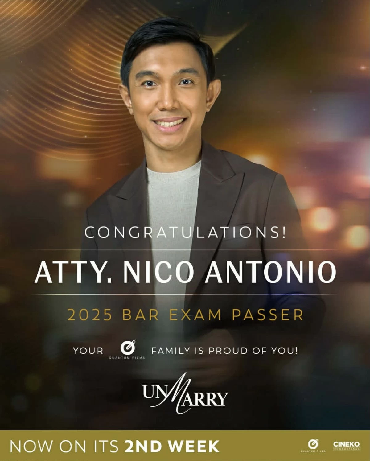 Actor Nico Antonio, who portrays a lawyer in the 51st Metro Manila Film Festival hit drama "UnMarry," has successfully passed the 2025 Bar examinations.