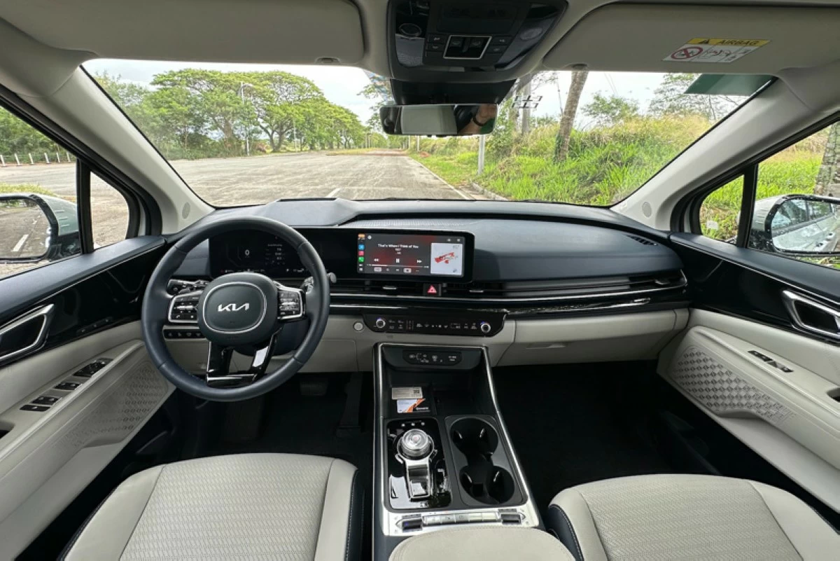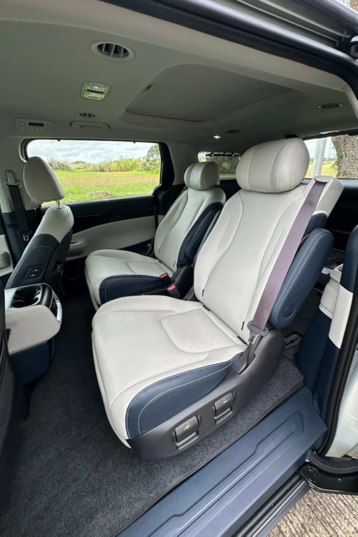 I would describe the Carnival Turbo Hybrid as a luxury MPV, leather all around and amenities that you would find in premium executive sedans or vans. The interior doesn't leave you wanting, leather seats, second row captains chairs with power adjust. Up front, you get a full digital instrument display that blends into the 12.3-inch infotainment screen giving the illusion of one wide screen. The audio sounds pretty good from the six-speaker audio system, and it has dual sunroof and dual power sliding doors.