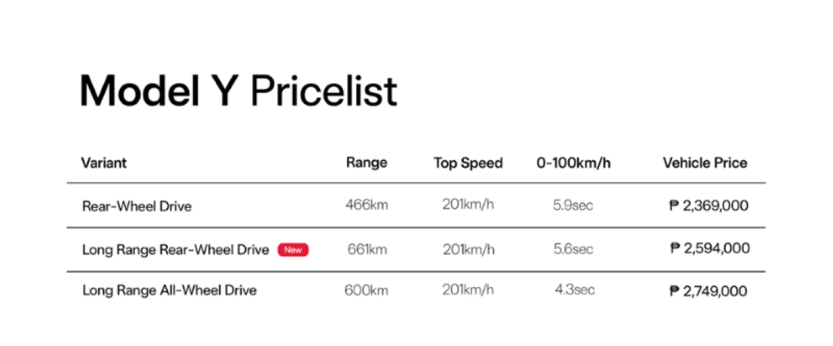 On the SUV side, Tesla said the Model Y Long Range RWD has been added as a new variant for the Philippine market. The company listed the vehicle with a claimed driving range of up to 661 km on a single charge for Long Range Rear-Wheel Drive models equipped with 19-inch wheels, alongside a peak charging rate of 250 kW. Tesla’s stated charging estimate for the variant is up to 267 km of range in 15 minutes at a Supercharger station.