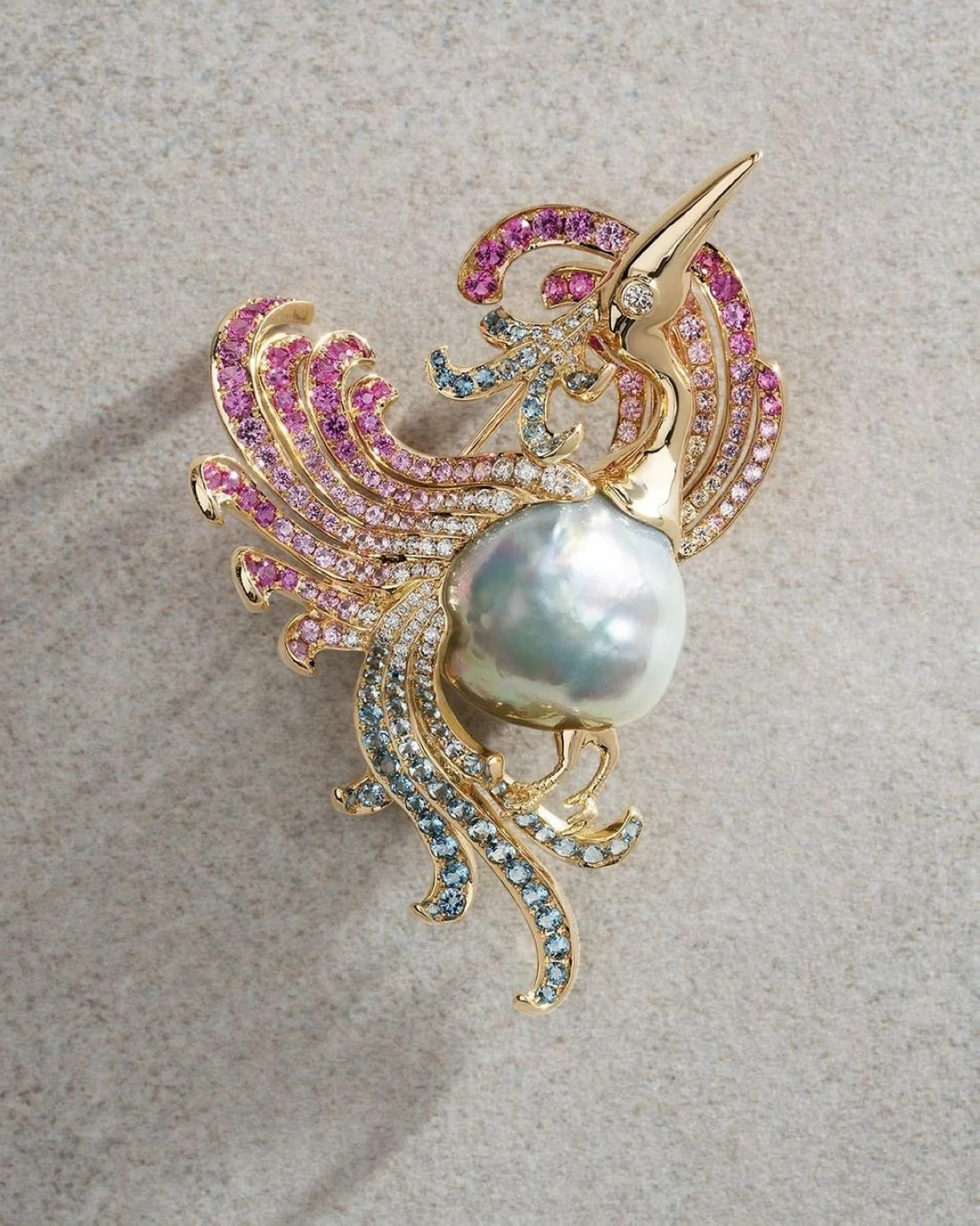 Some pieces double as jewelry. An example is Jewelmer’s 2023 piece, “Pamana,” which features a lustrous South Sea pearl, sapphires, diamonds, and gold forming the shape of the mythical Sarimanok bird. Amami’s “Relikaryo” and “Repolyo Rosa” designs highlight the country’s traditional tambourine jewelry, while Natalya Lagdameo’s bespoke brooches find elegance in clustered pearls and organic lines.