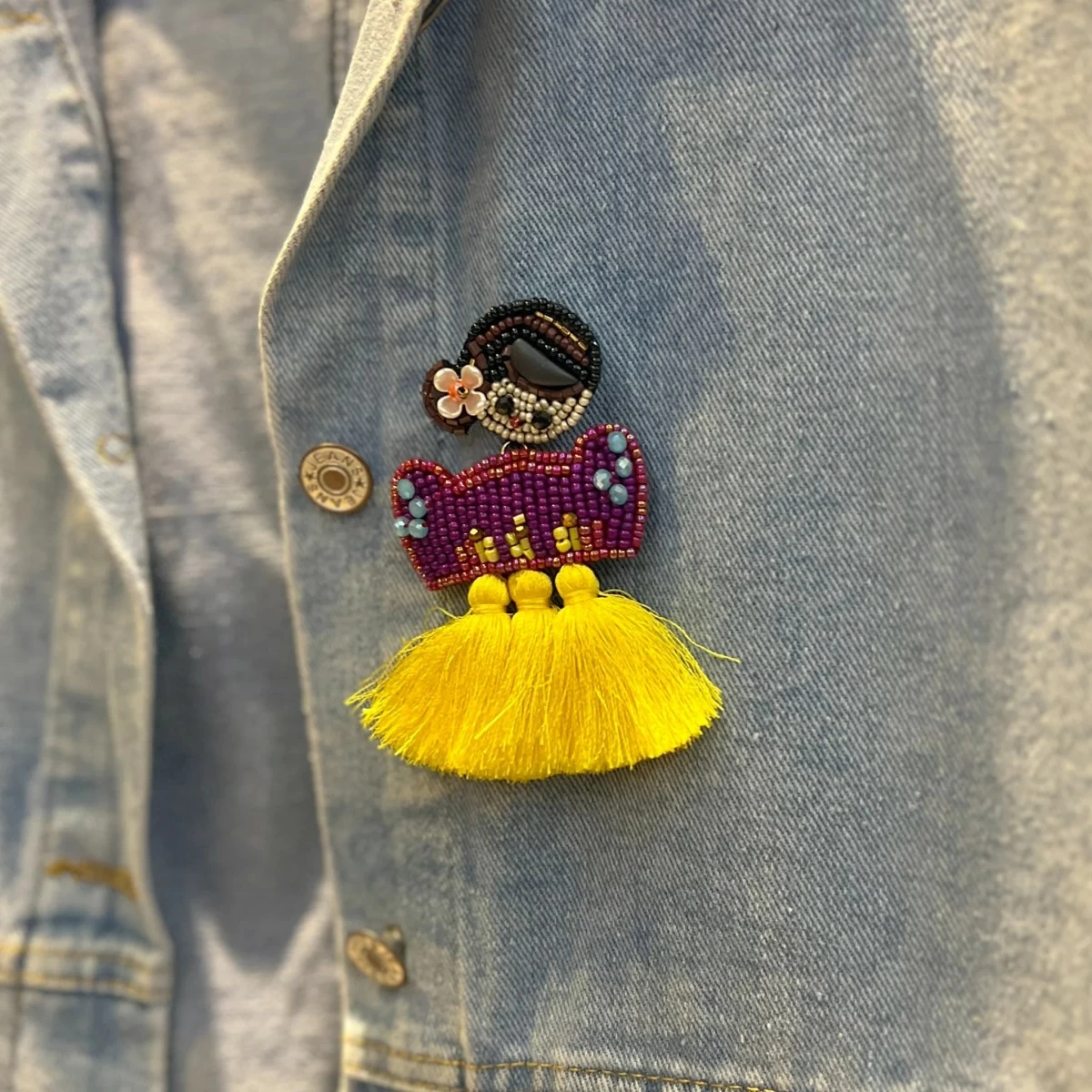 Fashion designer Daryl Maat presents a take on brooches that deviates from the use of metals and stones. His pieces—such as “Lobo,” “Kendi,” “Tala,” and “Saranggola”—spotlight handwoven inabel, reflecting Filipino culture, joy, and identity. In the same vein, Boho Manila explores Filipino iconography through beads and tassels, creating mosaic images of a jeepney, a bulak (flower), and a Filipino maiden.