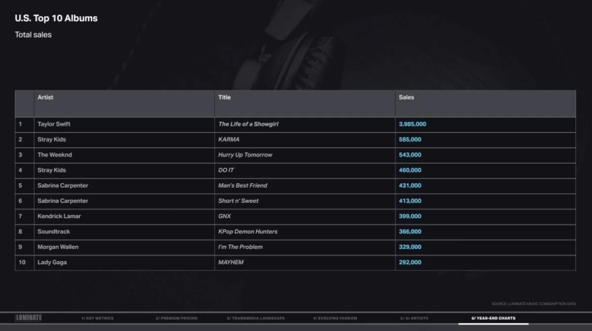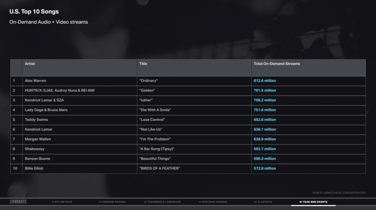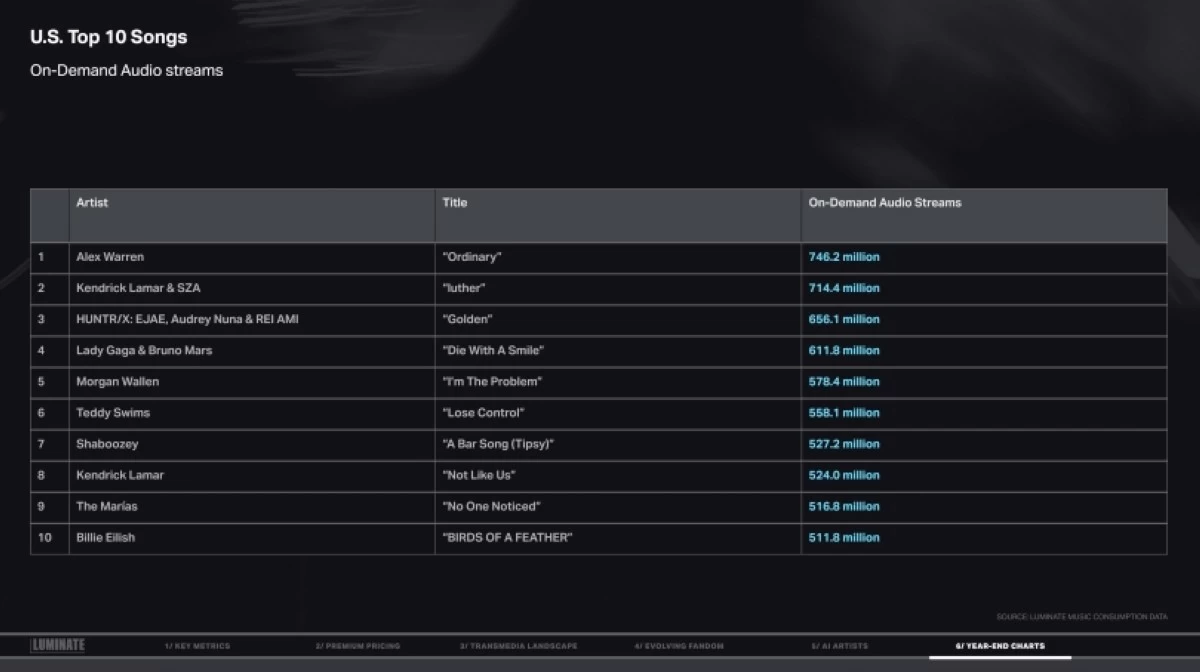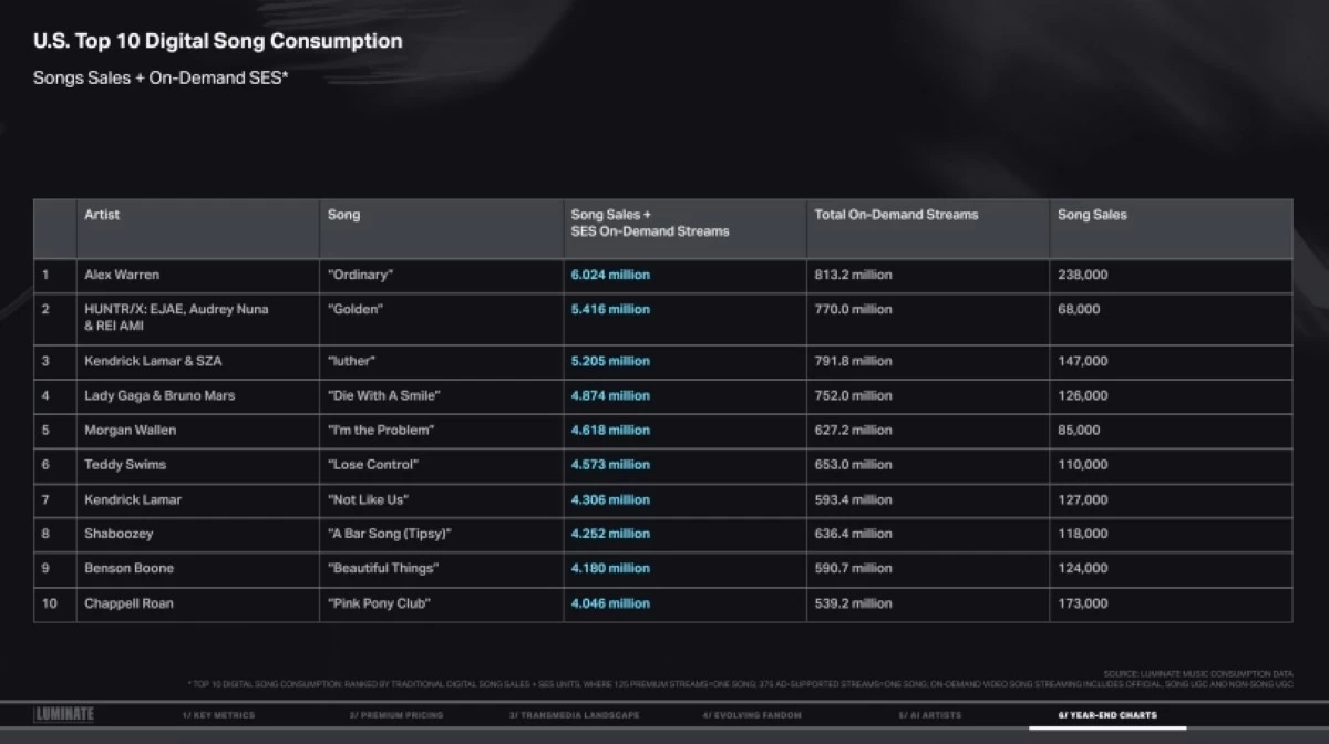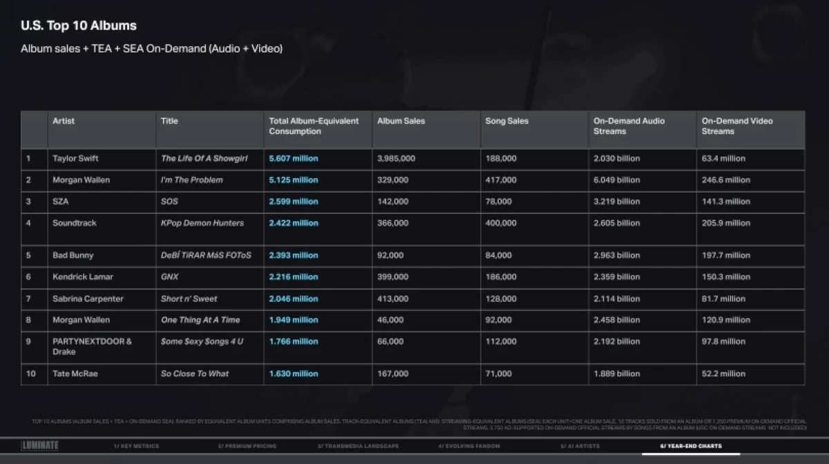 Here are the year-end charts from Luminate’s 2025 Year-End Music Report: